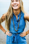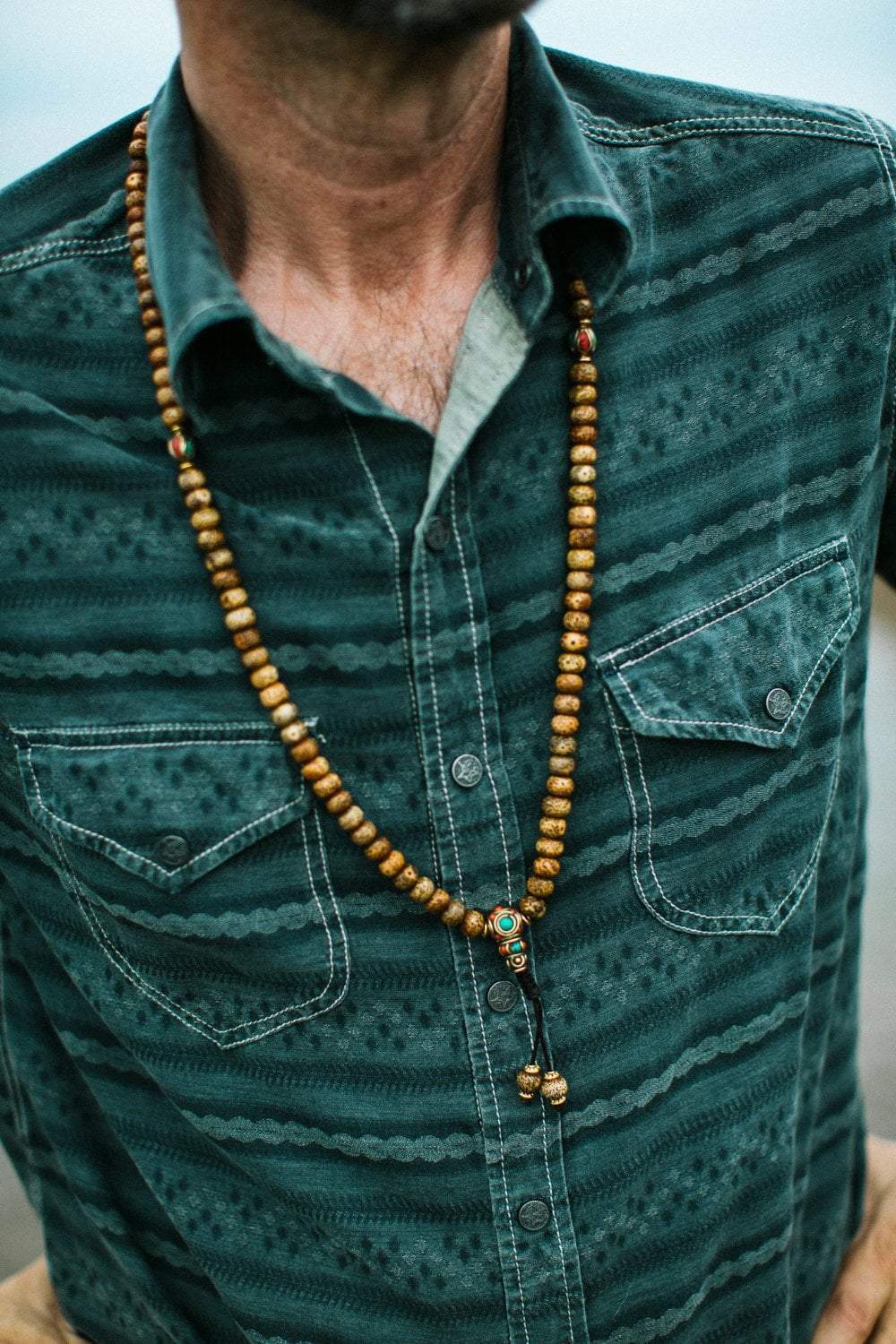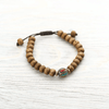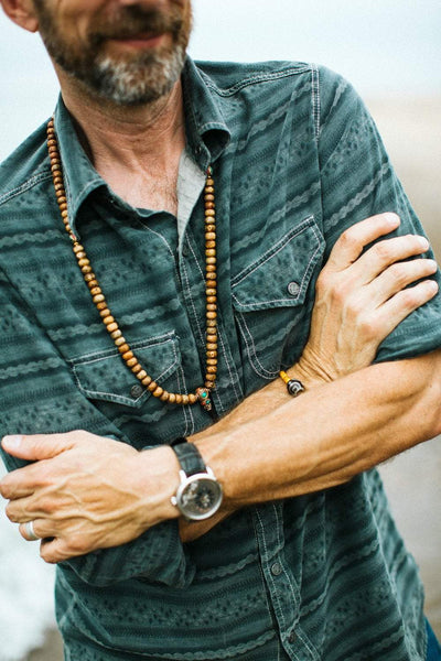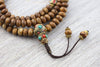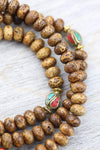• The Lotus Seed beads are lightly tumbled for comfort and naturally stained to achieve their earth-toned appearance. Each brass Tibetan bead is inlaid with pieces of turquoise and coral.