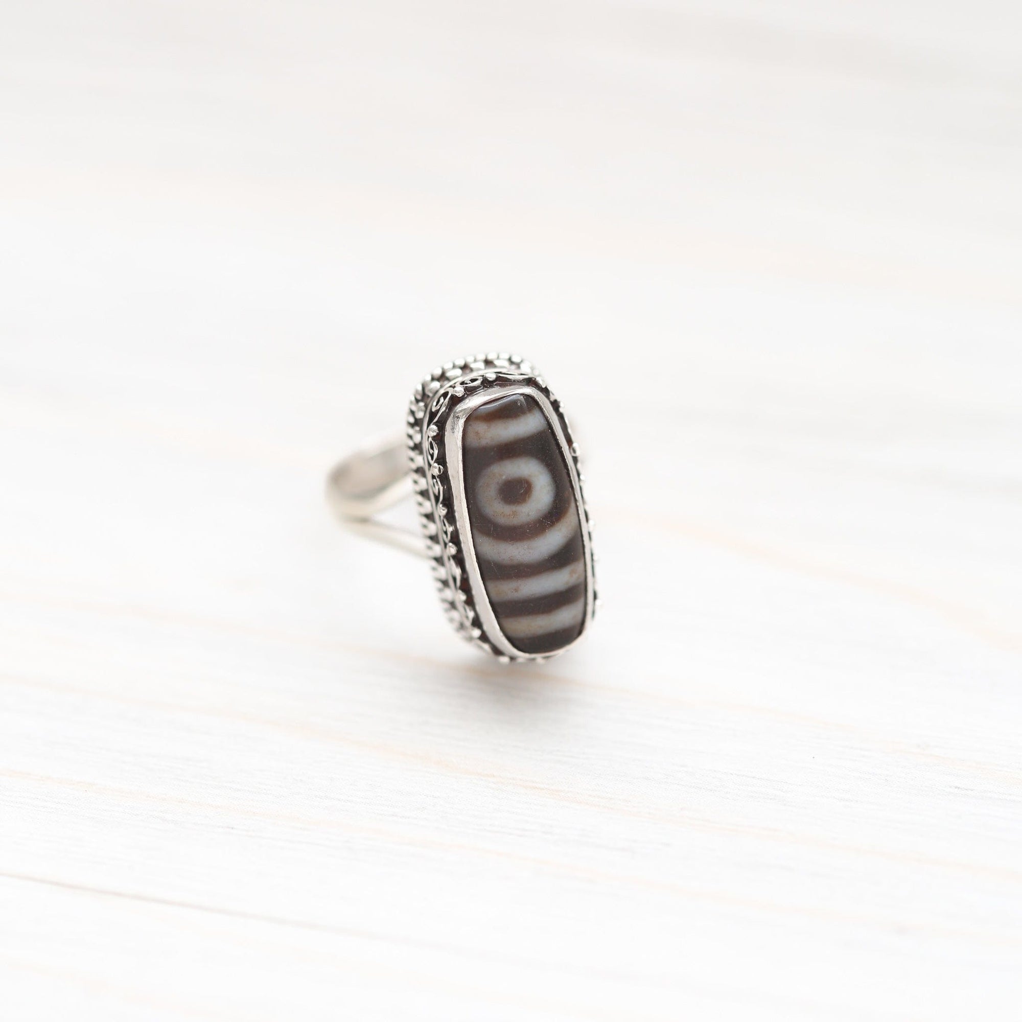 • Crafted in sterling silver and handmade by silversmiths in Kathmandu, this ring features a genuine 1-Eye Dzi bead from Nepal—an artifact steeped in history, mystery, and protection.