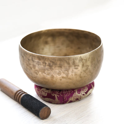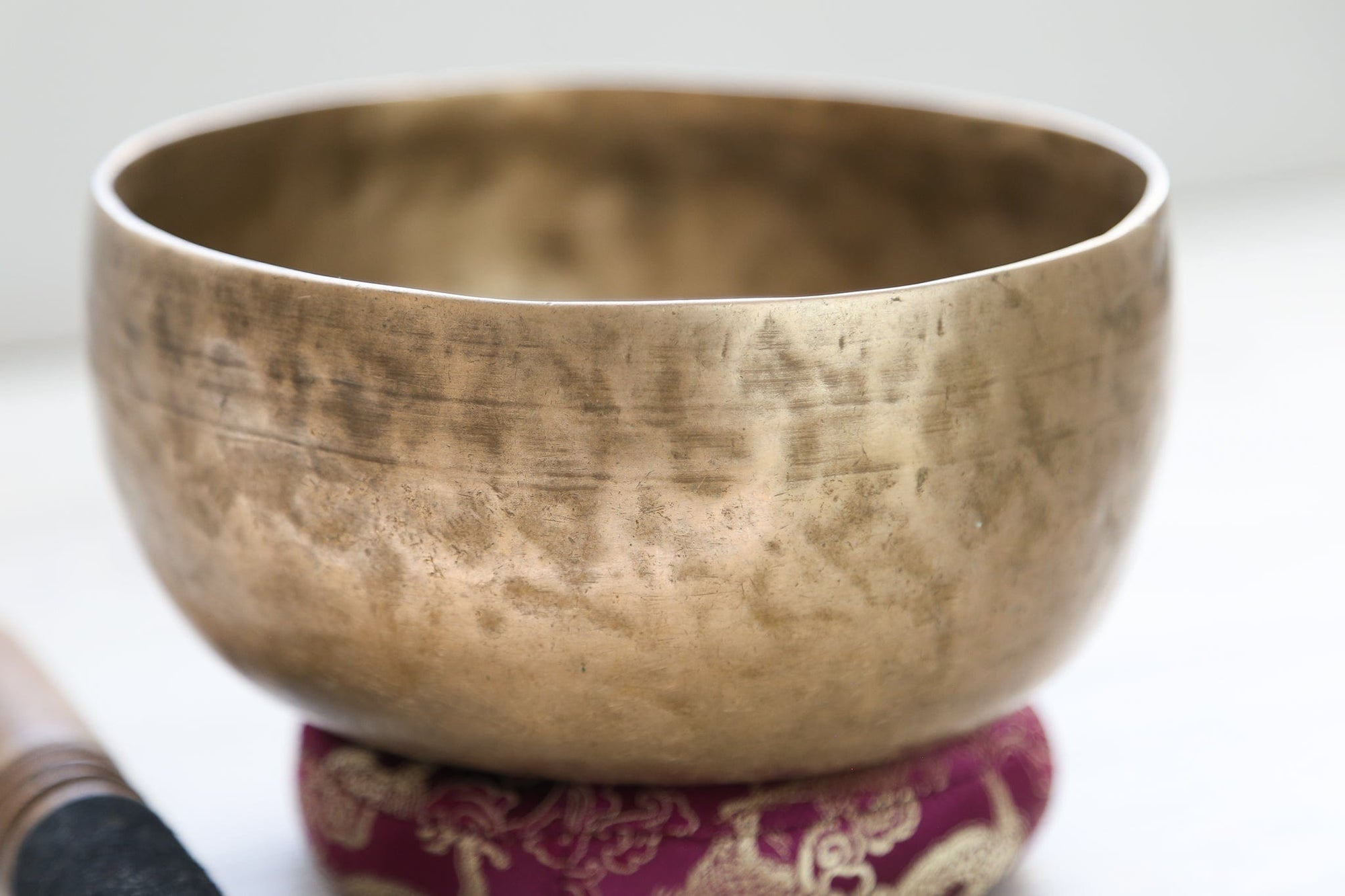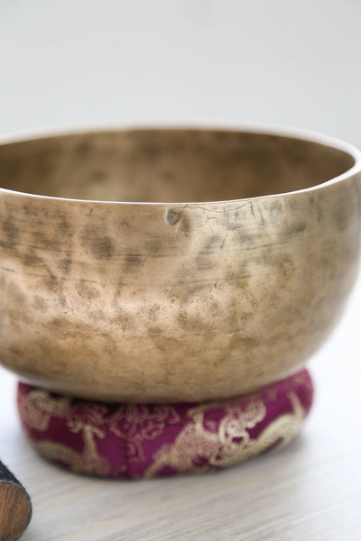Each time we're able to get a small collection of these bowls is exciting as they are exceptional. Antique Tibetan singing bowls are highly sought after for their remarkable quality of sound, rich tones, and unique physical characteristics. Every handmade mark tells a story of the bowls history! In your hands, we know that these bowls will continue to be a lifetime heirloom, telling their story through their unique markings and golden tones.