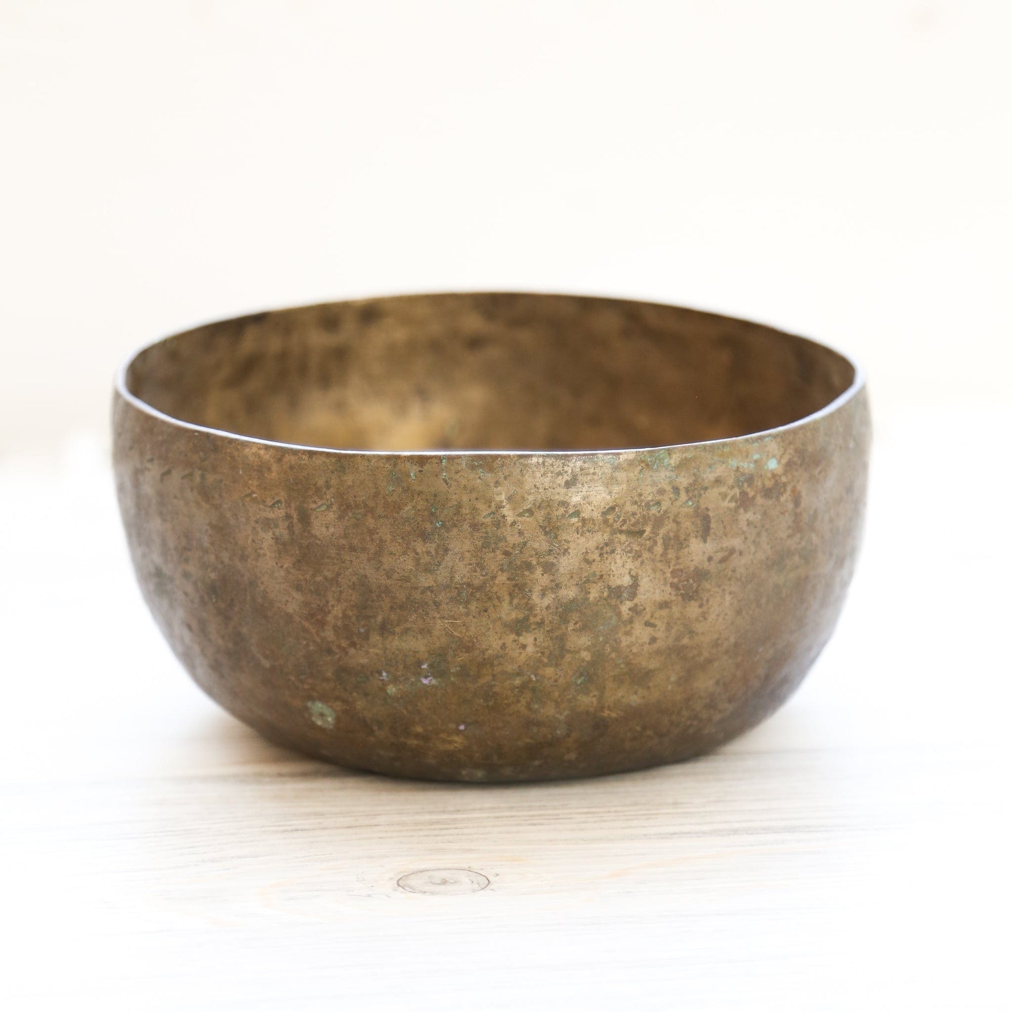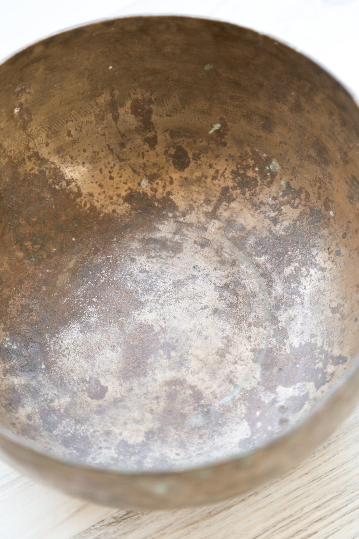 • This is a medium sized, beautifully aged, hand hammered singing bowl with high, thin walls. It features gorgeous signs of age and wear including some natural patina.