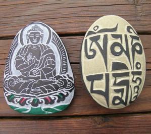 This large Om Mani stone is carved with great skill. The Buddha is hand painted and the Om Mani is on the reverse side. Made in Nepal. Size:approx 5 inches by 3