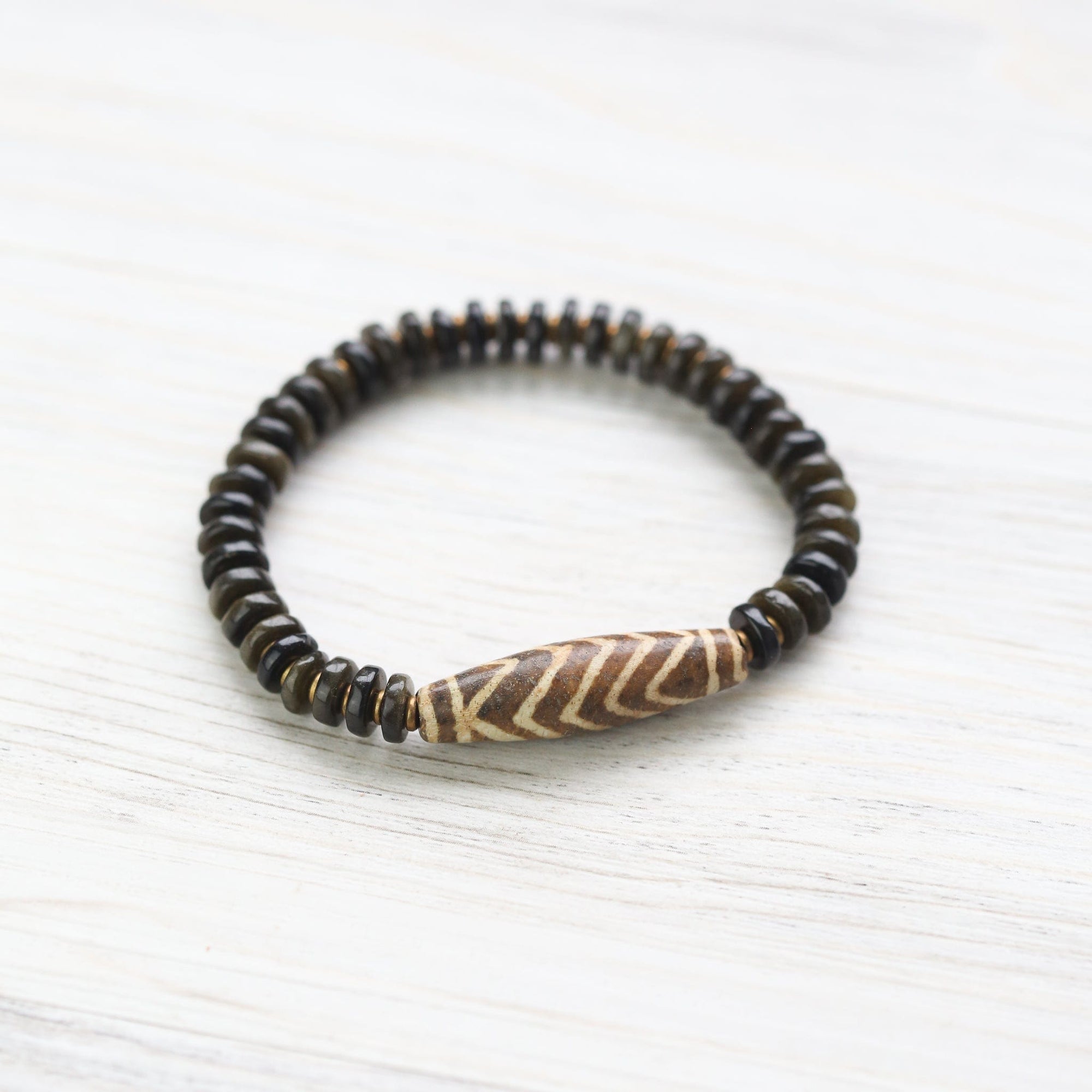 This bracelet features a Pumtek with five zig-zag stripes and two vertical stripes on each end.Because it is from the earth and was once organic material, petrified wood is known for its strong grounding properties and calming energies. Many Burmese and Tibetans revere these beads as prized spiritual objects that can also act as protection amulets.