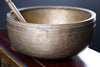 This exceptional, museum quality Jambati singing bowl features a thick rim with a visibly hand hammered finish and tuning marks around the outer rim.  It is an extra large sized, beautifully aged, hand hammered singing bowl.  Jambati are among the largest of the Himalayan singing bowls with outward sloping sides and a relatively small base.