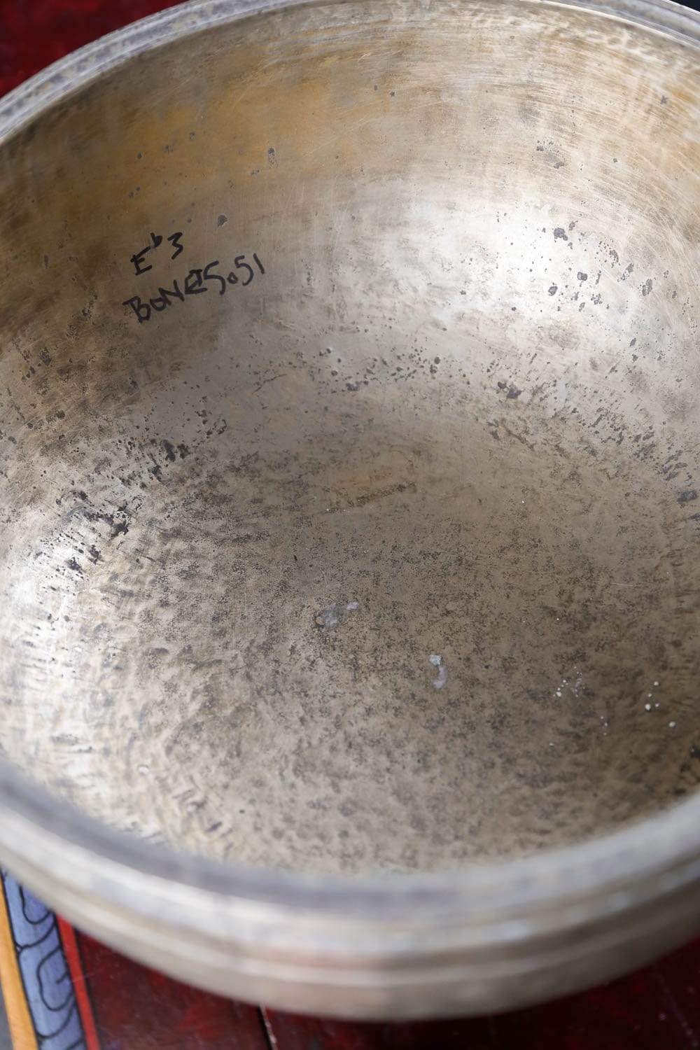 Each singing bowl from the Lost Collection features a unique identification number that links it to the rare antique collection.  In this case, it can be seen along the inside rim of the bowl.