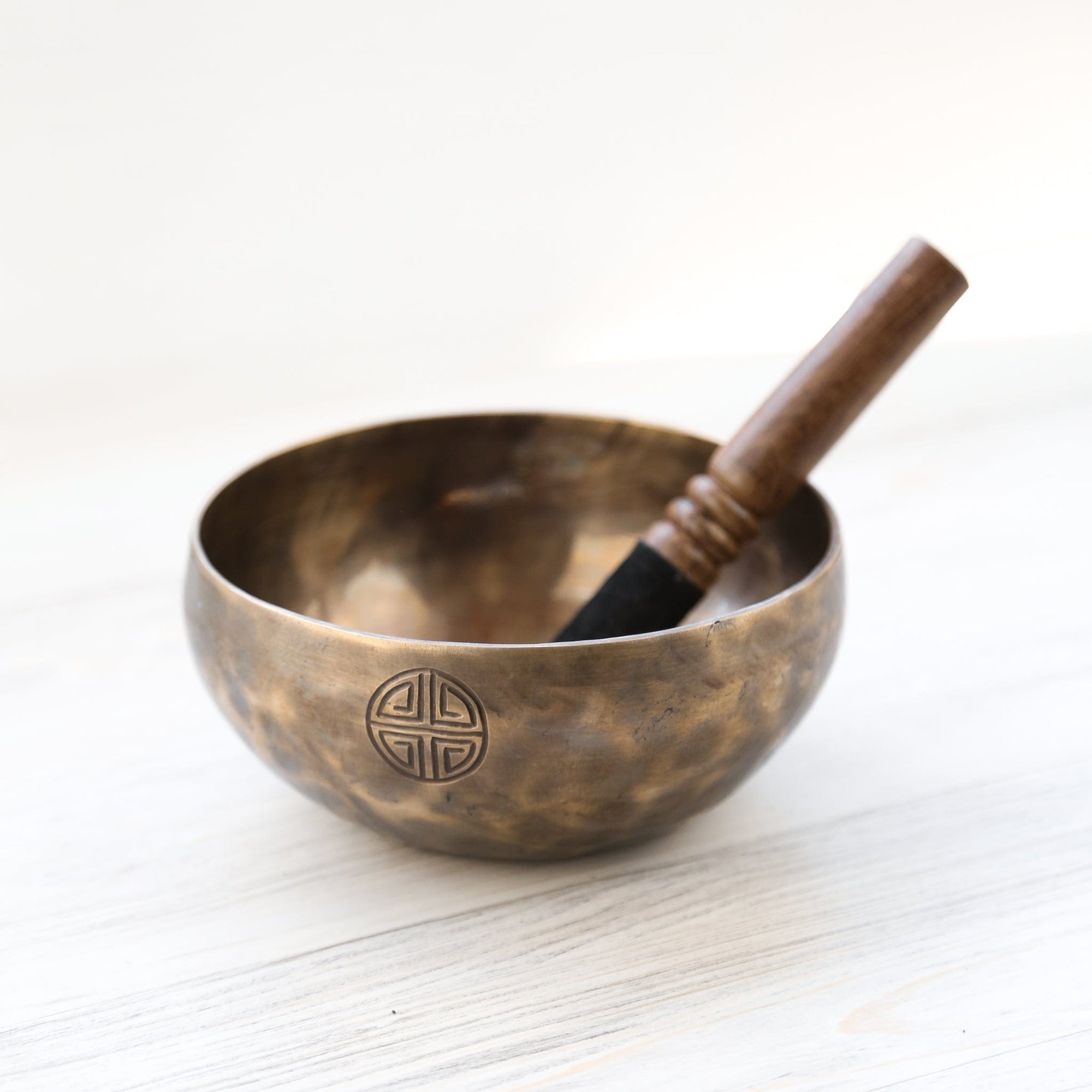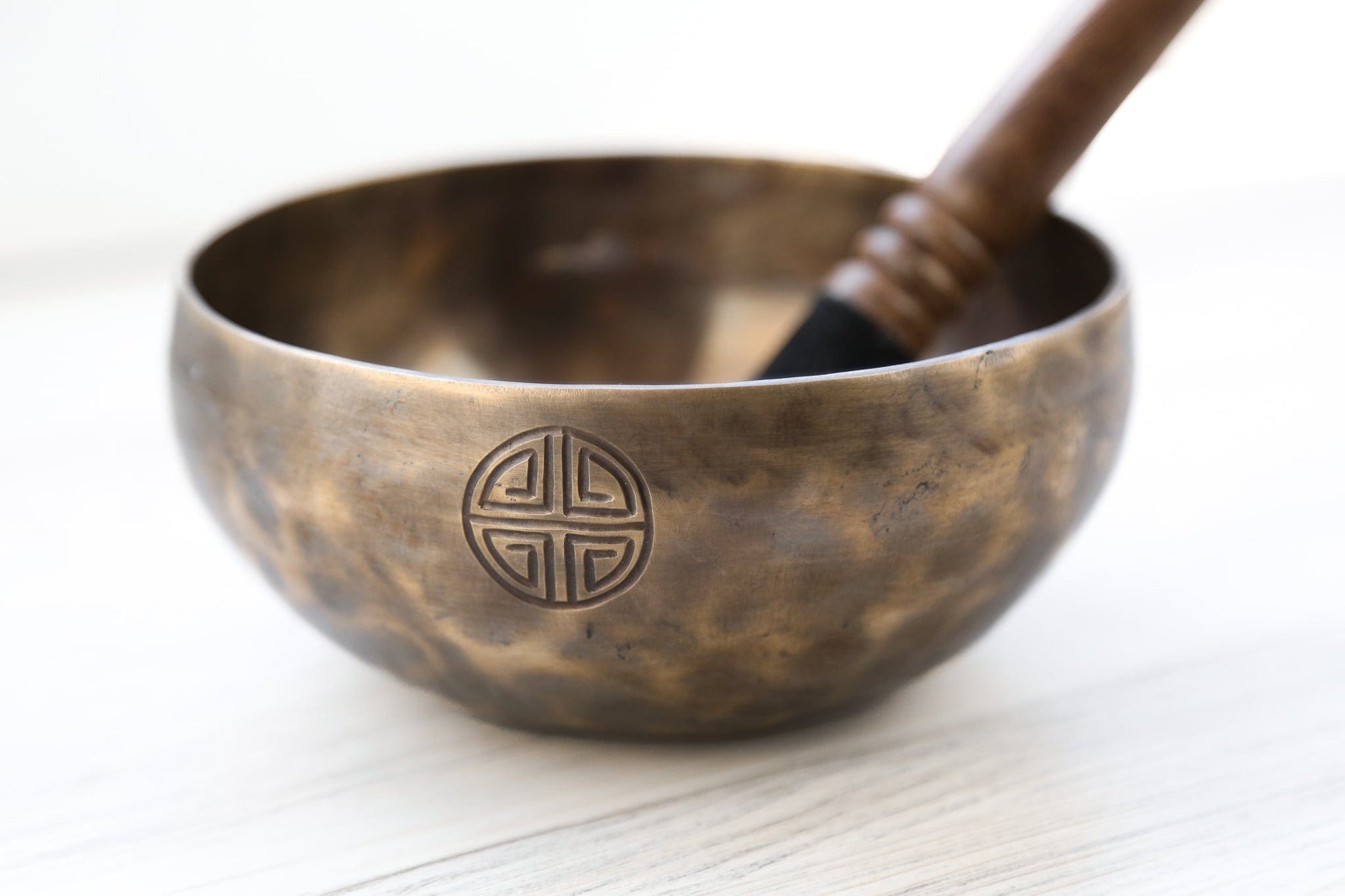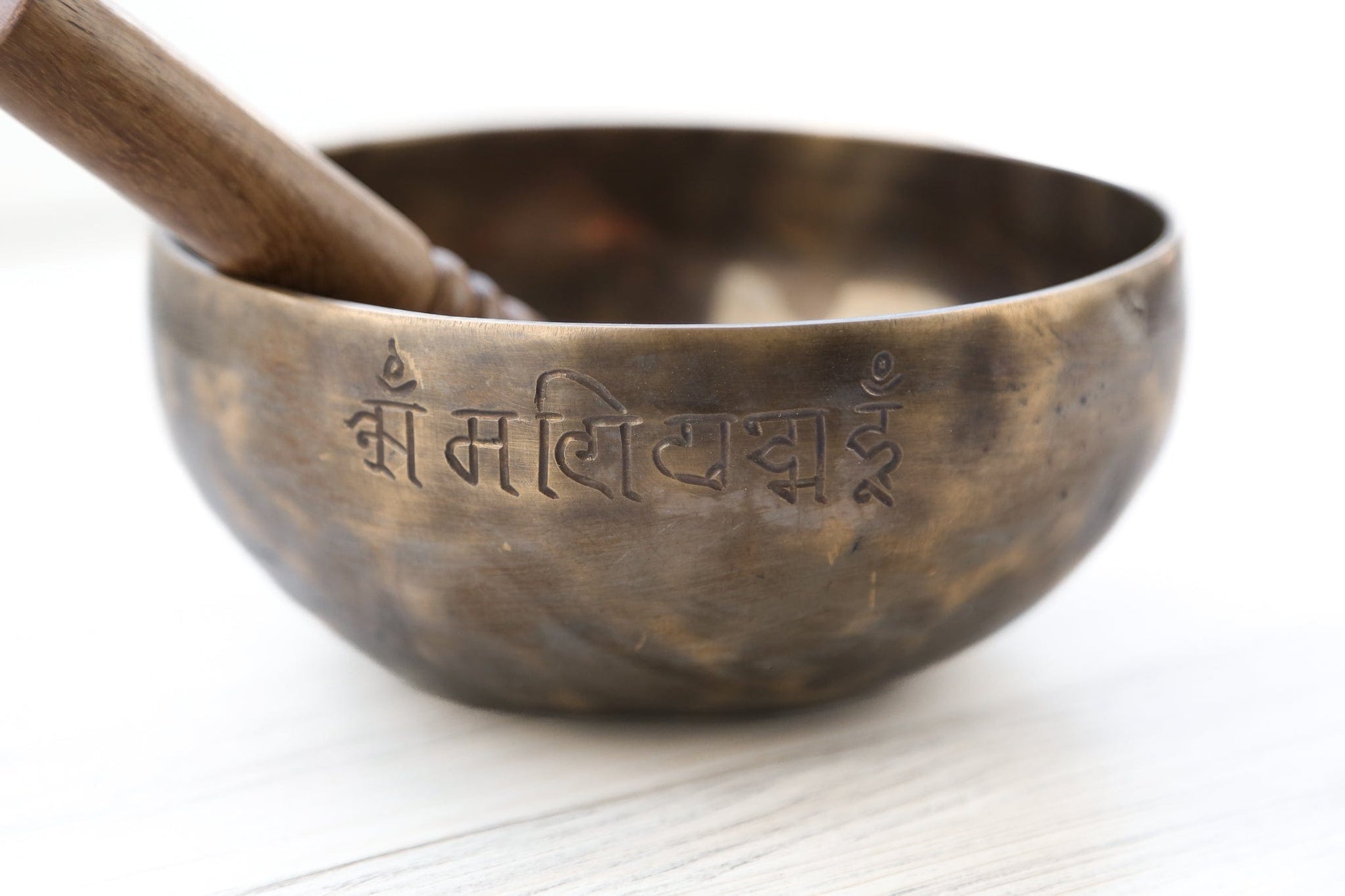 Each bowl features gorgeous hand carved details including an exclusive Full Moon Singing Bowl stamp and the mantra of compassion in Tibetan script.