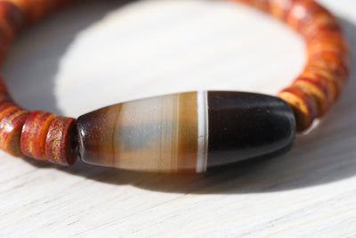 Striped agates like these are actually the original beads, before the traditional "eye" Dzi beads, that Tibetans collected. This is why striped agates are sometimes referred to as the "Mother of Dzi". Tibetan Buddhists believe that agate helps stabilize the aura and eliminate negative energies. Every bead has its own beautiful details just like a beloved Dzi. It also carries rich spiritual significance, making this not just an accessory, but also a tool for mindfulness and peace.