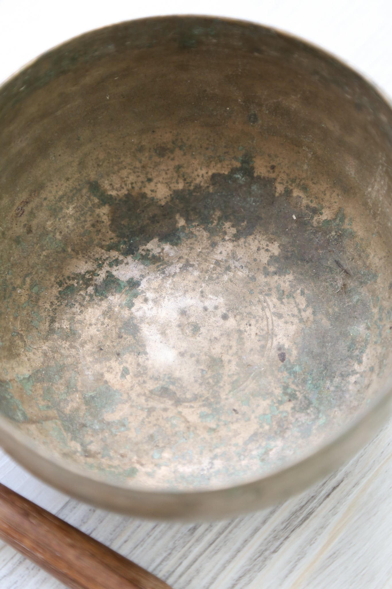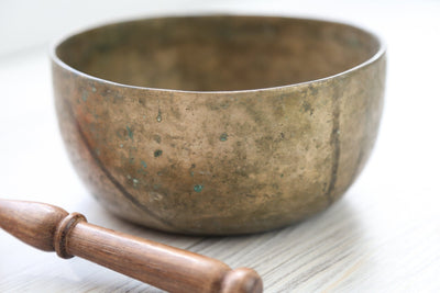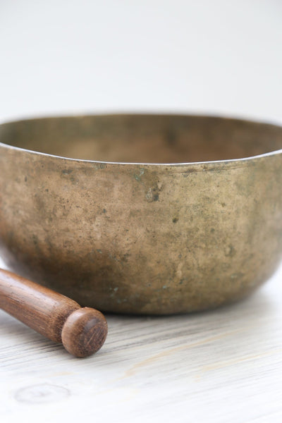 Each time we're able to get a small collection of these bowls is exciting as they are exceptional. Antique Tibetan singing bowls are highly sought after for their remarkable quality of sound, rich tones, and unique physical characteristics. Every handmade mark tells a story of the bowls history! In your hands, we know that these bowls will continue to be a lifetime heirloom, telling their story through their unique markings and golden tones.