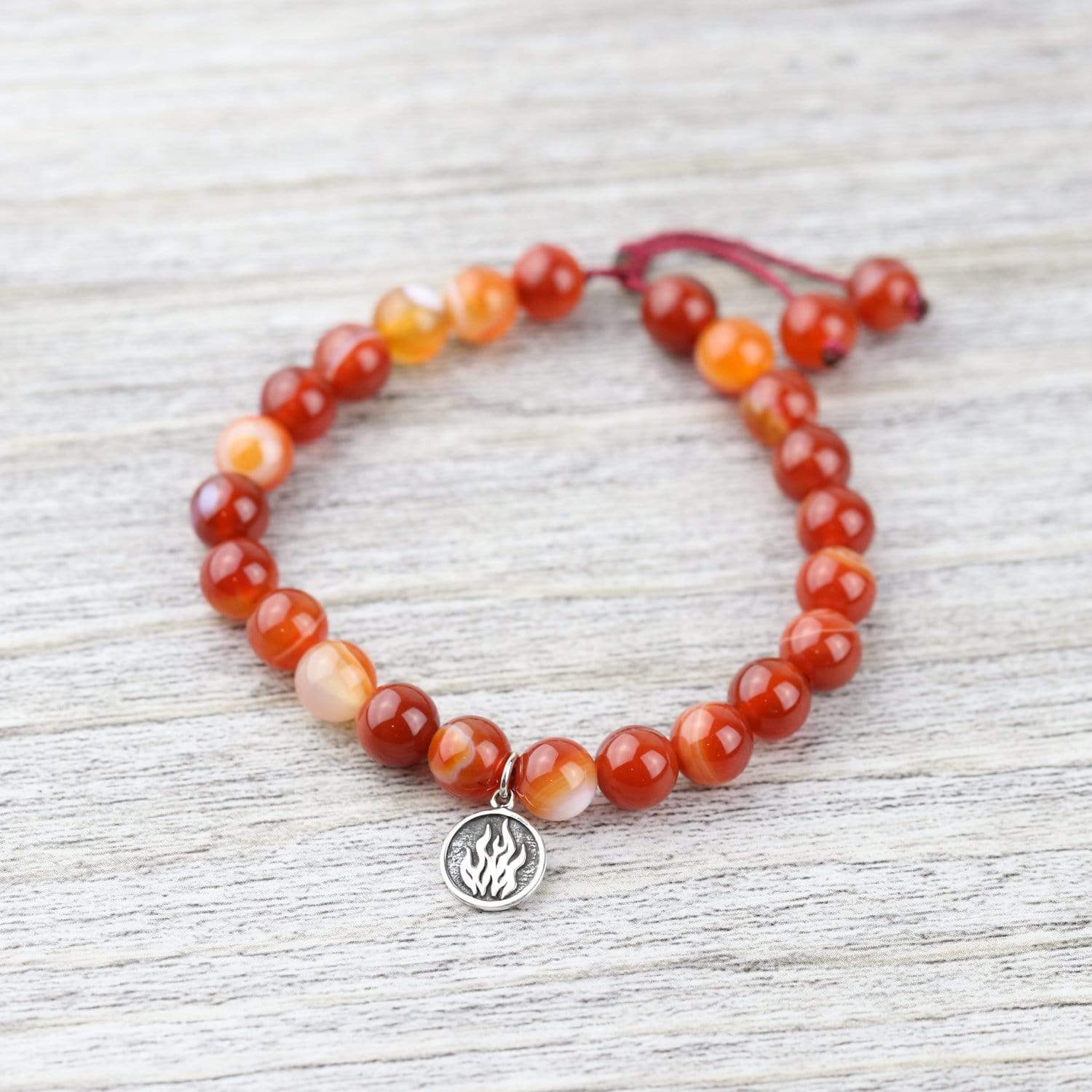 • Our fire element wrist mala is made right here in Michigan at the DharmaShop with red Sardonyx agate beads on adjustable cord.