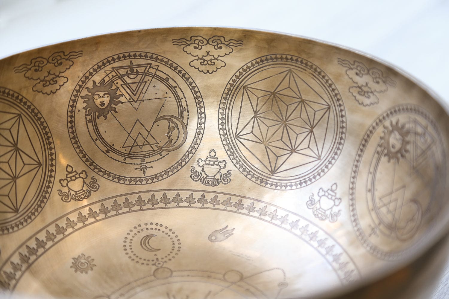 • Inside features stunning astrological symbols including moon phases surrounding the sun, sacred geometric shapes, Tibetan clouds, and parasols. The sacred geometry symbol, the Flower of Life, grounds the base of the bowl while the outside features spirals and symbols for good luck.
