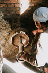 Your bowl comes with a wood and suede striker and our large gold brocade ring cushion hand stitched and stuffed with up-cycled materials. Includes a DharmaShop keepsake bag.