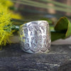 Detailed pattern stamped into Hill Tribe silver (.98 pure). Ring is 1 inch wide at front of band. Features intricate stamped details and a radiant shine that rarely needs to be polished.