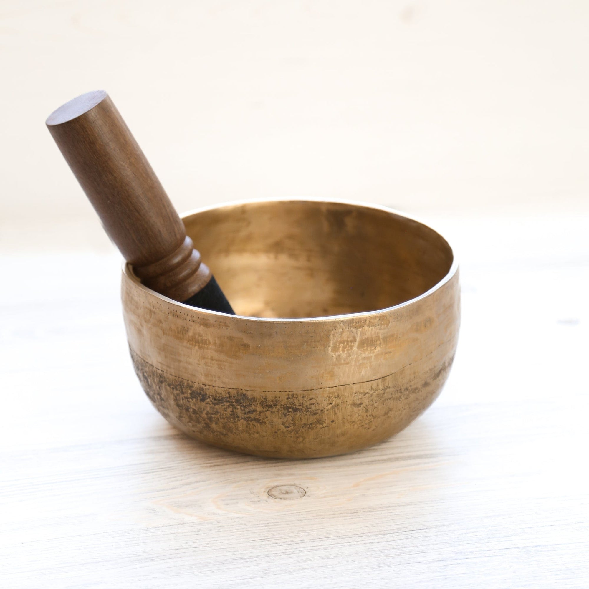Each time we're able to get a small collection of these bowls is exciting as they are exceptional. Antique Tibetan singing bowls are highly sought after for their remarkable quality of sound, rich tones, and unique physical characteristics. Every handmade mark tells a story of the bowls history! In your hands, we know that these bowls will continue to be a lifetime heirloom, telling their story through their unique markings and golden tones.