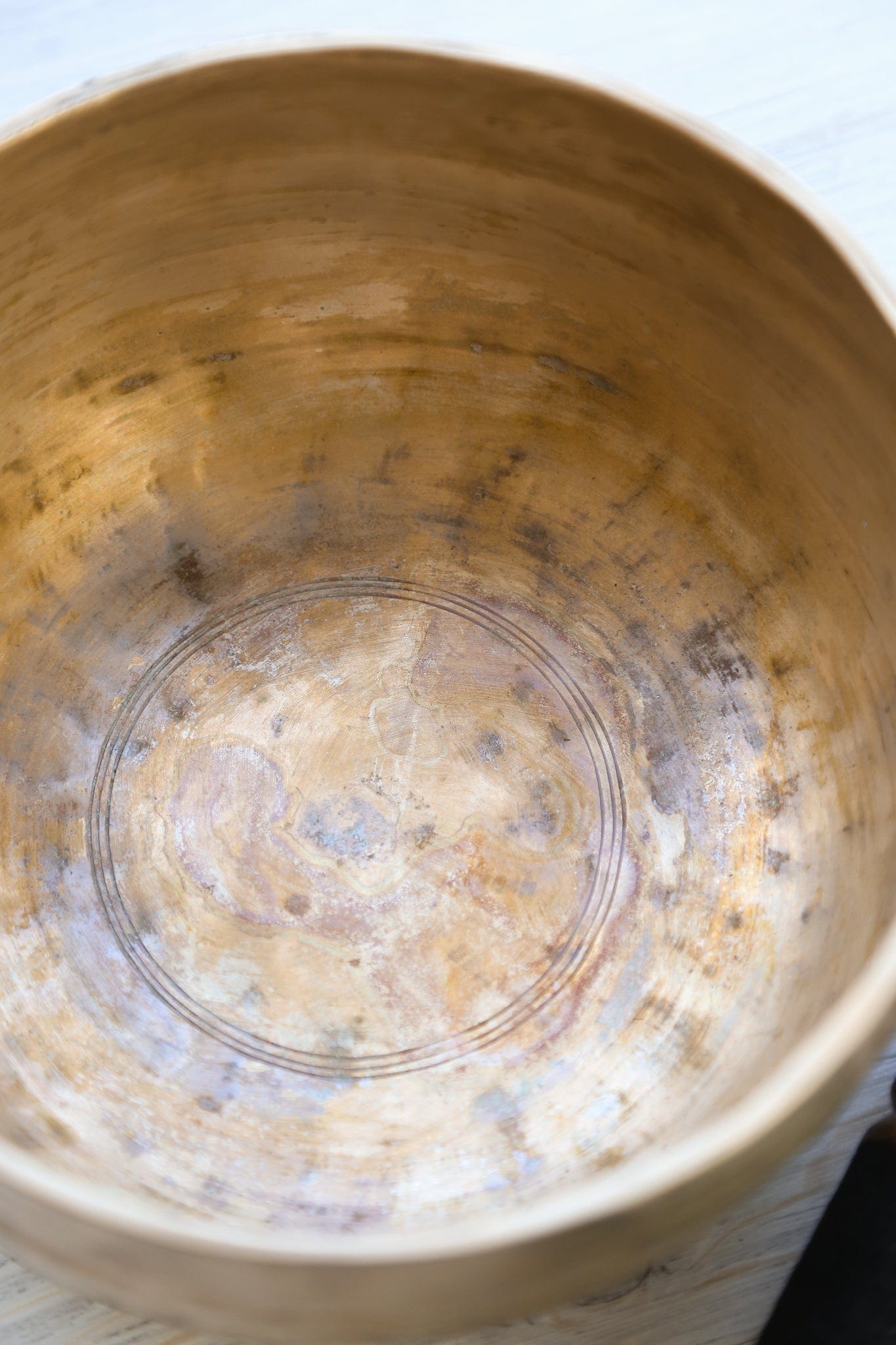 • This is a medium sized, beautifully aged, hand hammered singing bowl with gorgeous signs of age and wear including visible hammer marks. A truly unique one-of-a-kind bowl with a slightly two-toned golden finish.