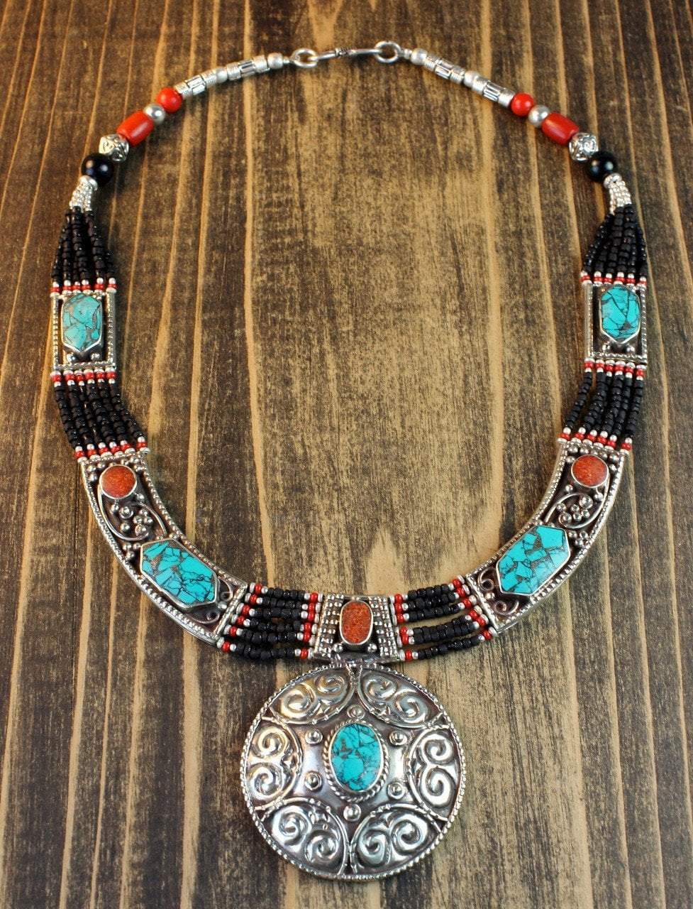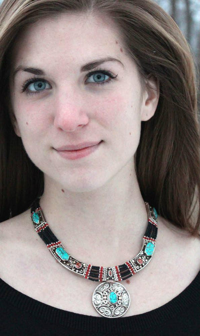 Our new Wheel of Dharma necklace is handmade by Karma Dolma in Kathmandu, Nepal.  Six strands of onyx beads, set off by silver trimmings, connect these traditional Tibetan turquoise and lapis pieces.