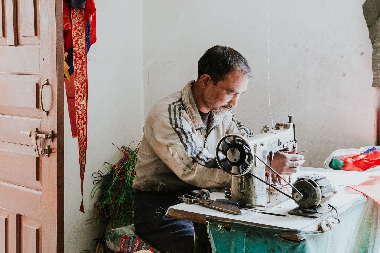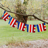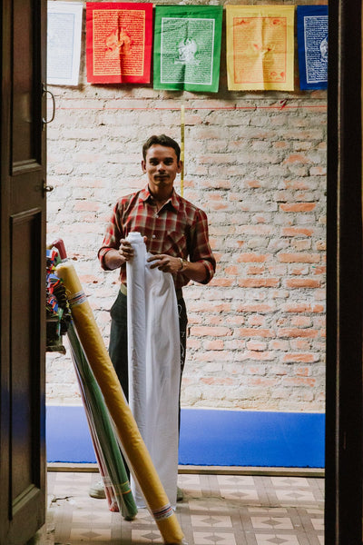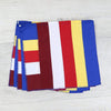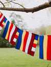 Set includes 5 flags that measure approximately 12 1/2 by 10 3/4 inches. Entire strand is about 8 feet long. Handmade of hemmed cotton in Nepal.