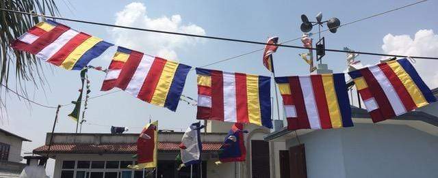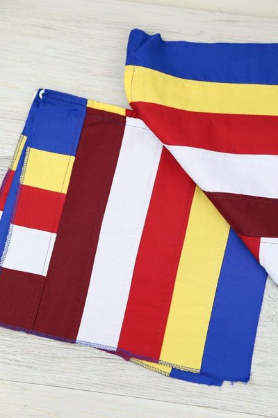 The colors on this flag represent the aura that emanated from the body of the Buddha when He attained Enlightenment under the bodhi tree. The horizontal stripes represent the races of the world living in harmony, and the vertical stripes represent eternal world peace.
