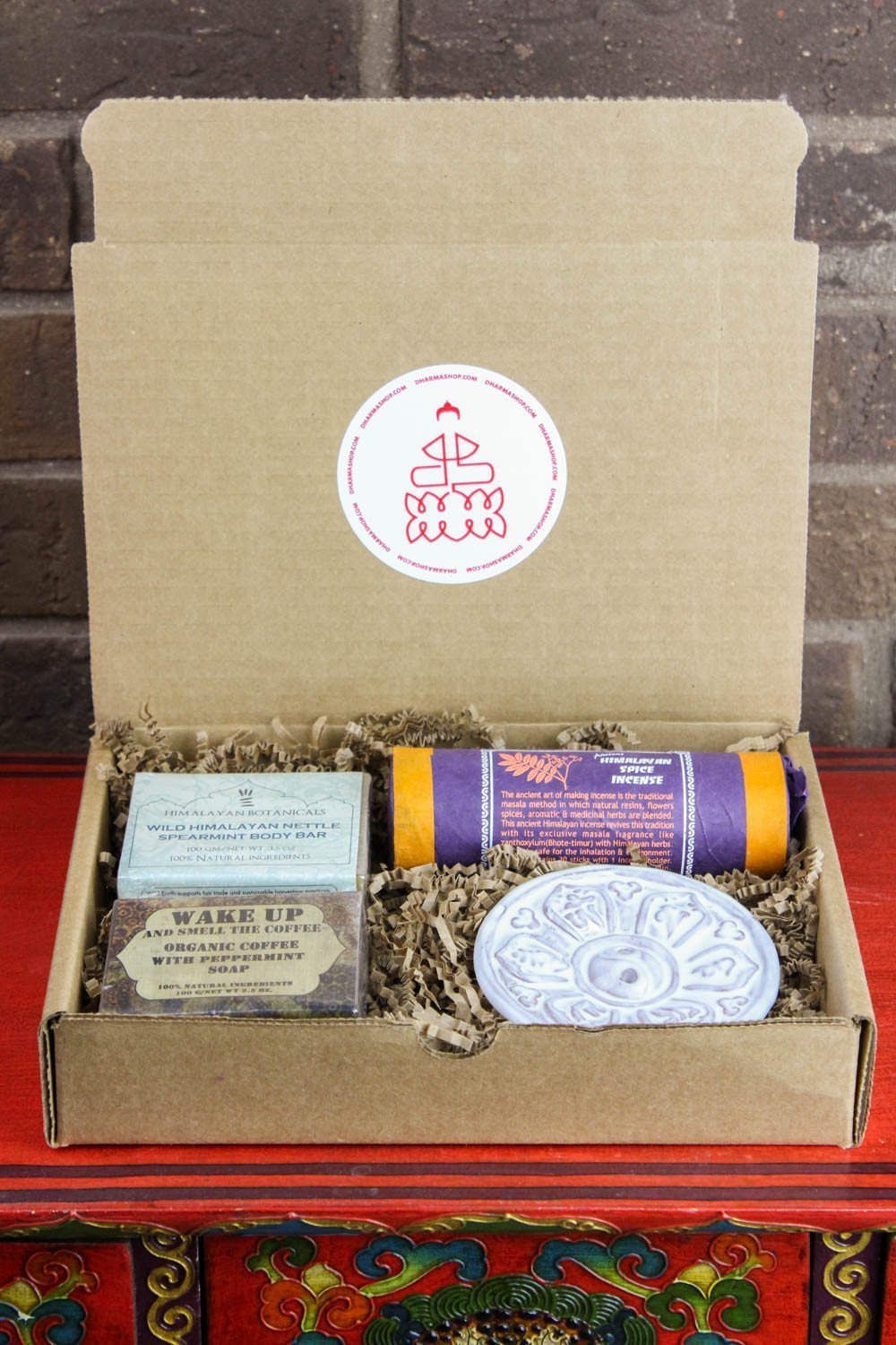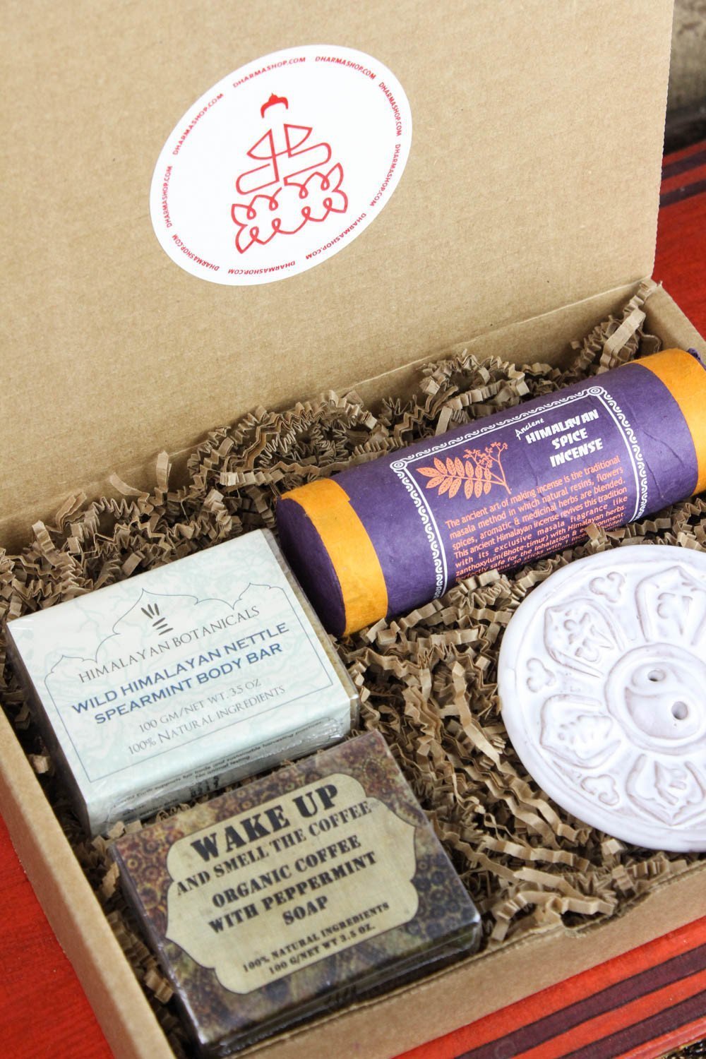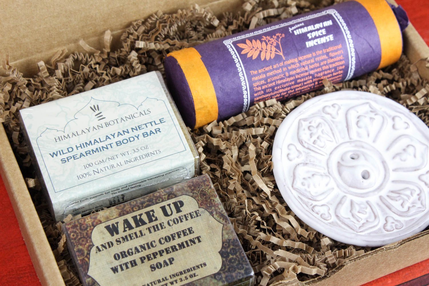 Awaken your senses with our new Himalayan scent inspired gift box! Set includes Himalayan Spice Incense, our White Om Mani burner, and two styles of our handmade soaps. The Wild Himalayan Nettle Spearmint Body Bar and "Wake Up and Smell the Coffee" Organic coffee with peppermint soap are made with 100% natural ingredients that leave your skin feeling and smelling amazing.