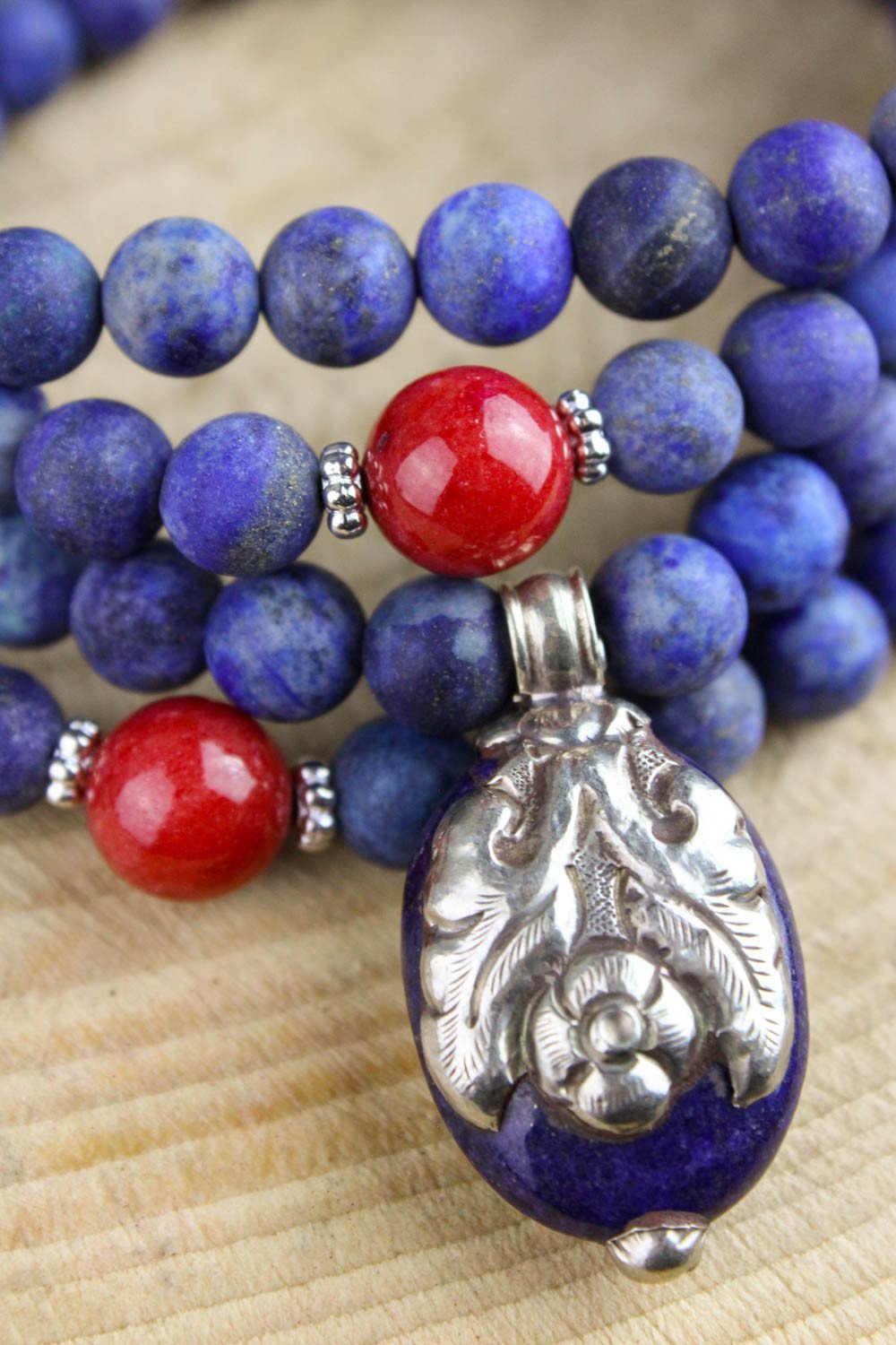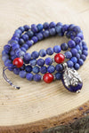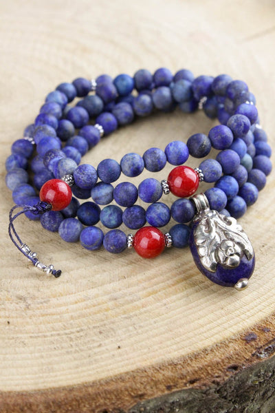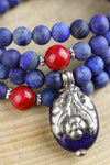 This bold and beautiful lapis bead mala features coral spacer beads and a high quality lapis stone pendant that is inlaid with a double-sided sterling silver flower design.