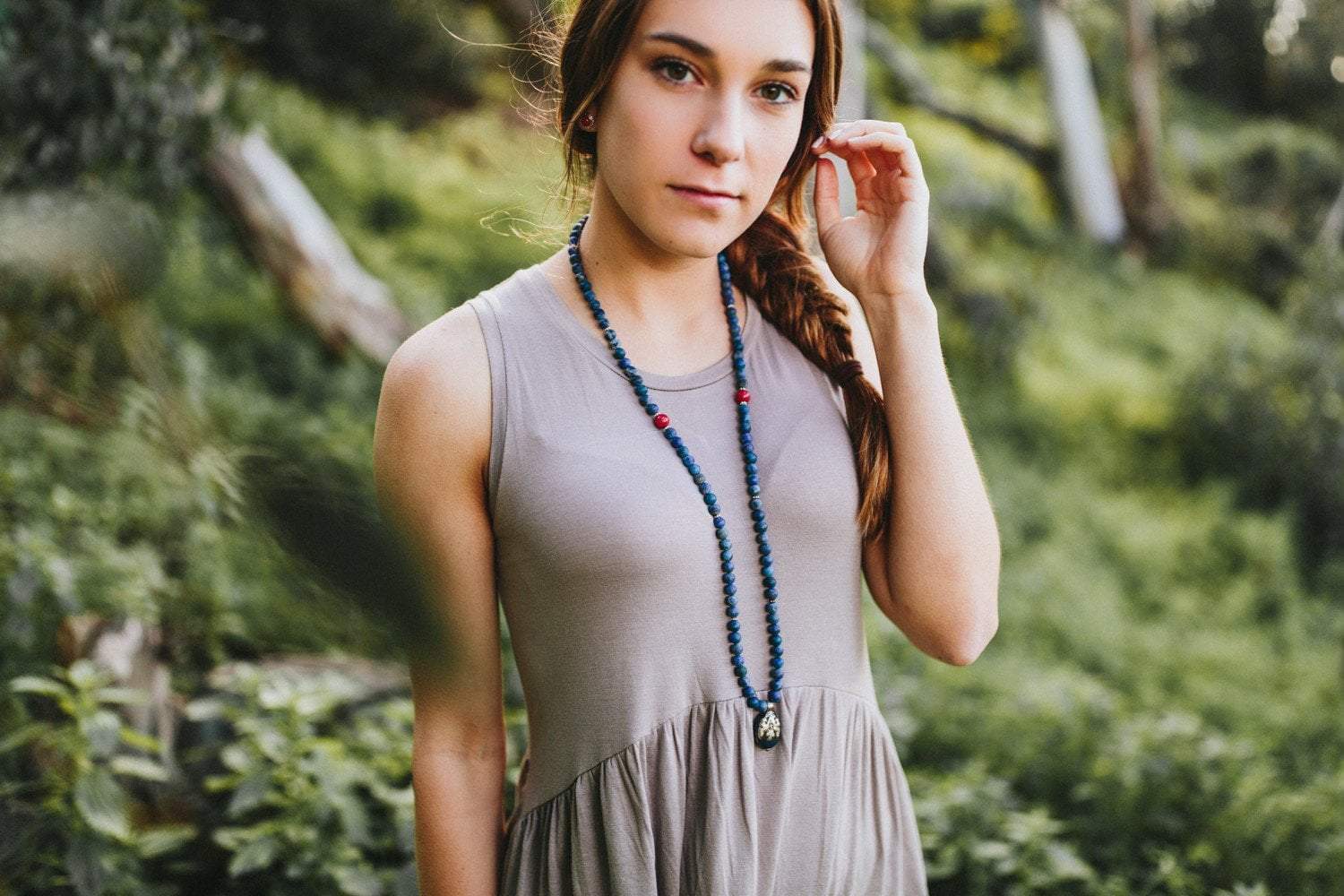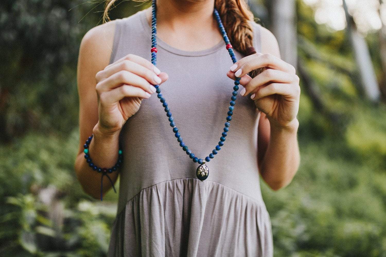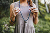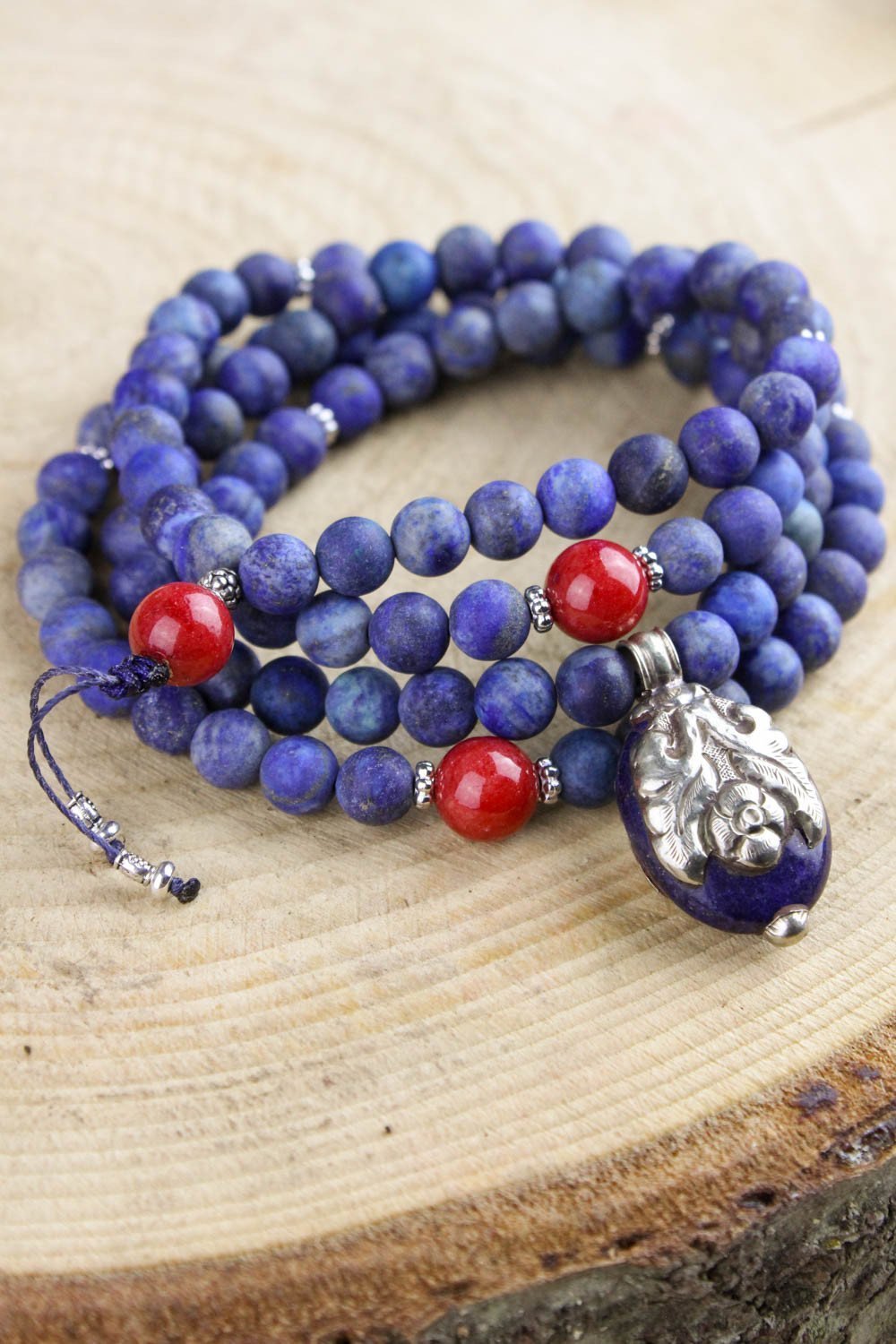This mala measures approximately 36 inches around. Contains 8mm lapis beads, three 10mm coral spacer beads, and one sterling silver lapis pendant that measures about 1 3/8 inches by 5/8 of an inch. Handmade right here in the DharmaShop!