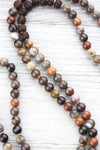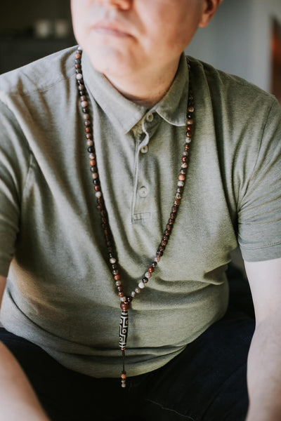 This exclusive DharmaShop mala is a well-traveled one to say the least. We took a stunning 9 Eye Dzi from Taiwan, Rudraksha from Nepal, Petrified Wood beads from Madagascar, and hand-strung them right here at the DharmaShop using traditional methods and design learned from our Mala artisans in Kathmandu. Aside from it being a gorgeous design, we hope it's journey to help you on yours is felt.