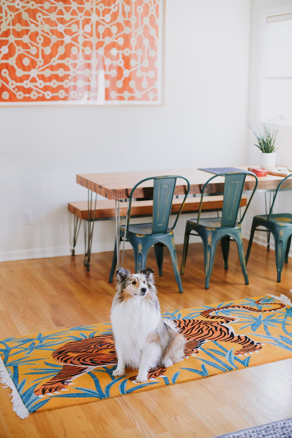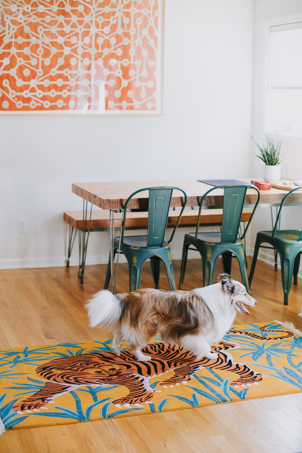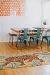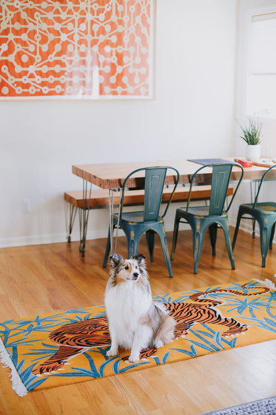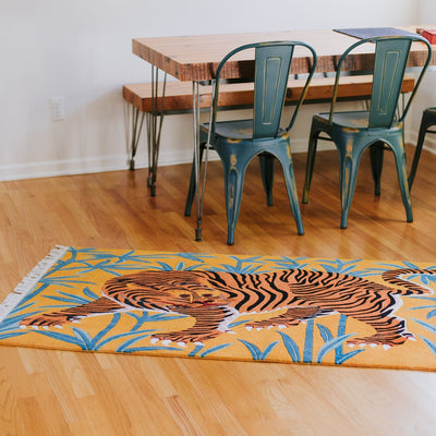 Each tiger carpet is made with 100% Tibetan and New Zealand wool that features a higher lanolin content, allowing water to bead on the surface of the carpet.
