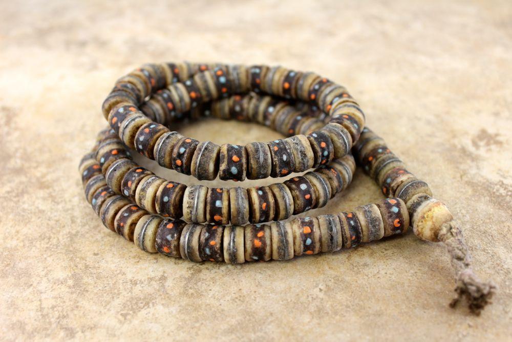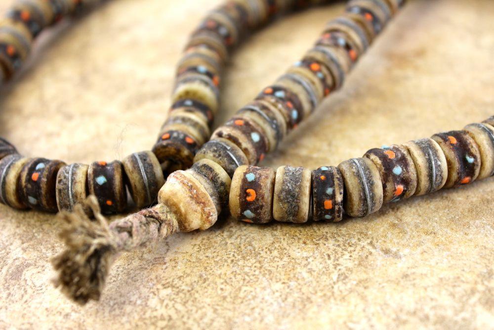 Measures approximately 31 inches in circumference with 7 by 10mm yak bone disc beads.