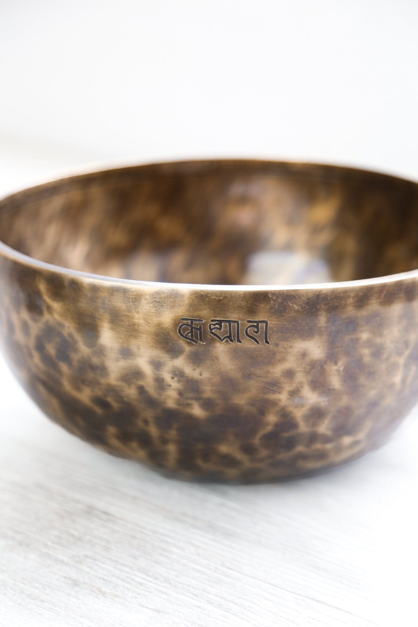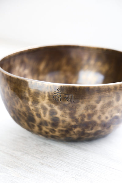 Each bowl features gorgeous hand carved details including an exclusive Full Moon Singing Bowl stamp and the mantra of compassion in Tibetan script. The mantra invokes the powerful benevolent attention and blessings of Chenrezig, the embodiment of compassion. The Full Moon Singing Bowl stamp is also known as a symbol of longevity and happiness.