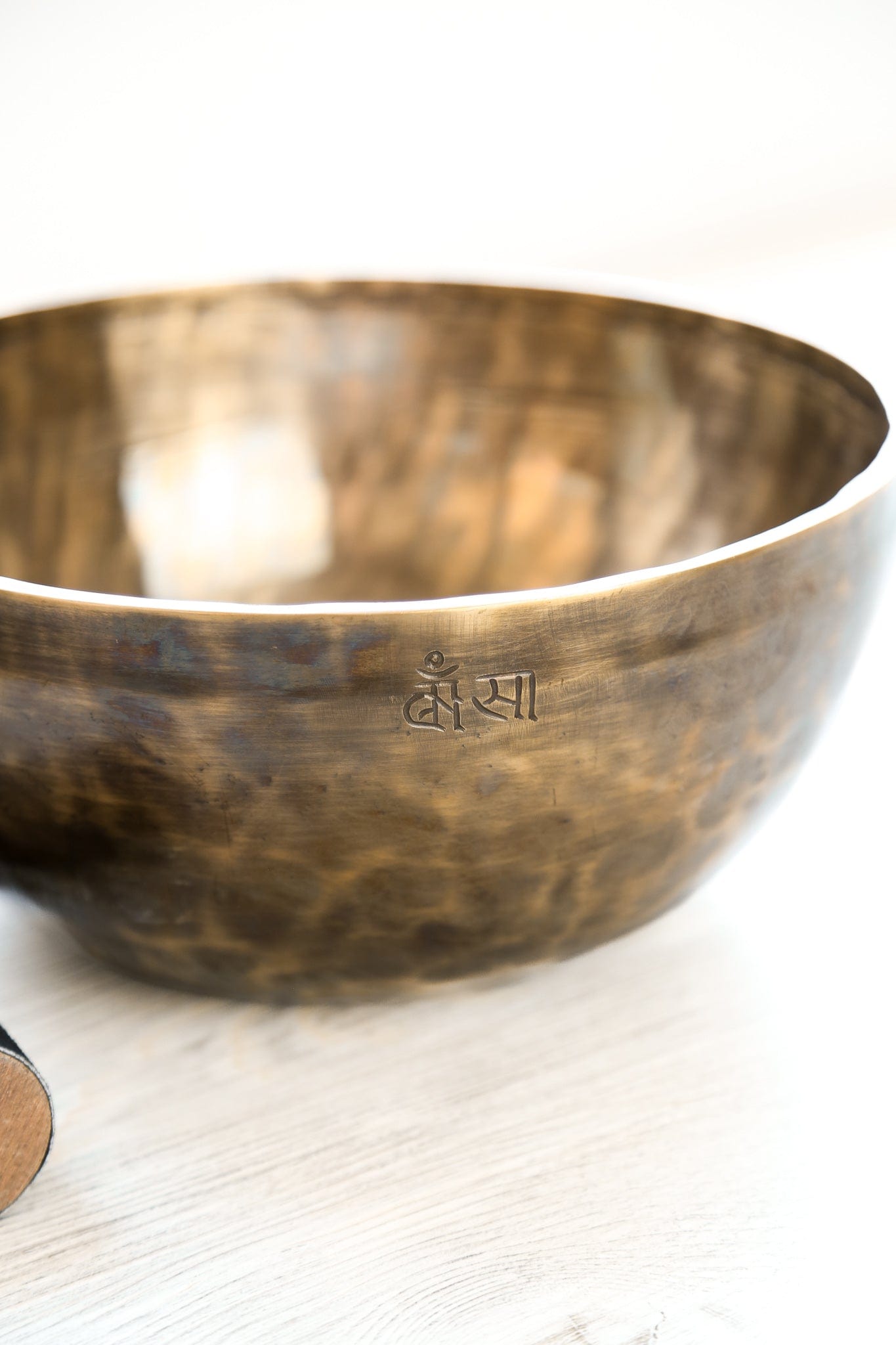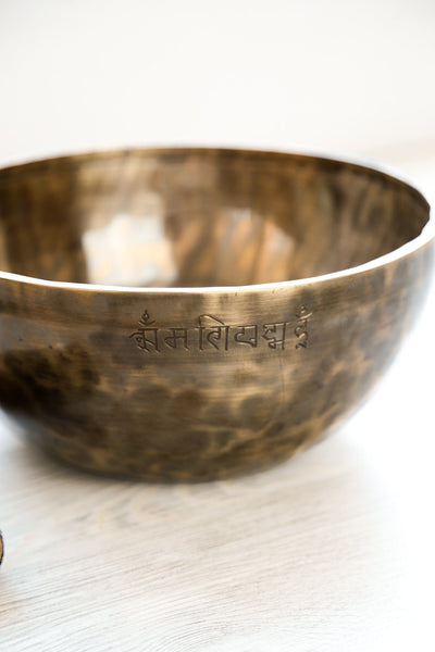 Each bowl features gorgeous hand carved details including an exclusive Full Moon Singing Bowl stamp and the mantra of compassion in Tibetan script. The mantra invokes the powerful benevolent attention and blessings of Chenrezig, the embodiment of compassion. The Full Moon Singing Bowl stamp is also known as a symbol of longevity and happiness.