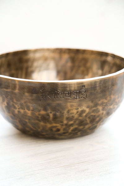 Each bowl features gorgeous hand carved details including an exclusive Full Moon Singing Bowl stamp and the mantra of compassion in Tibetan script. The mantra invokes the powerful benevolent attention and blessings of Chenrezig, the embodiment of compassion. The Full Moon Singing Bowl stamp is also known as a symbol of longevity and happiness.