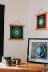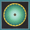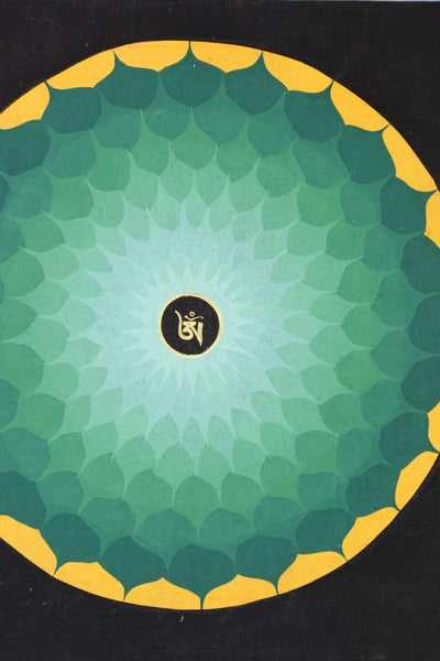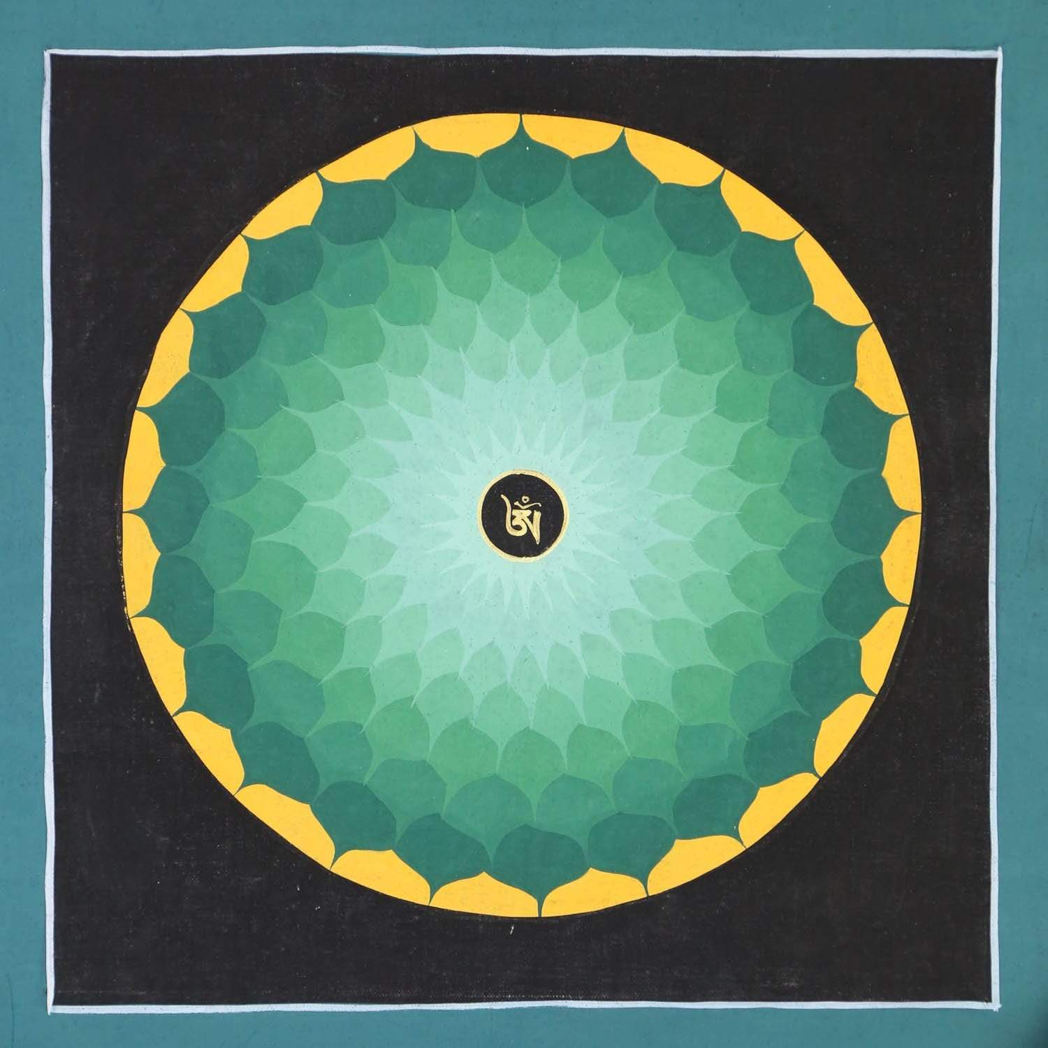 • This thangka features a turquoise monochromatic lotus flower design with Om in the center.  It has an energy of concentration and focus that is great for meditation!