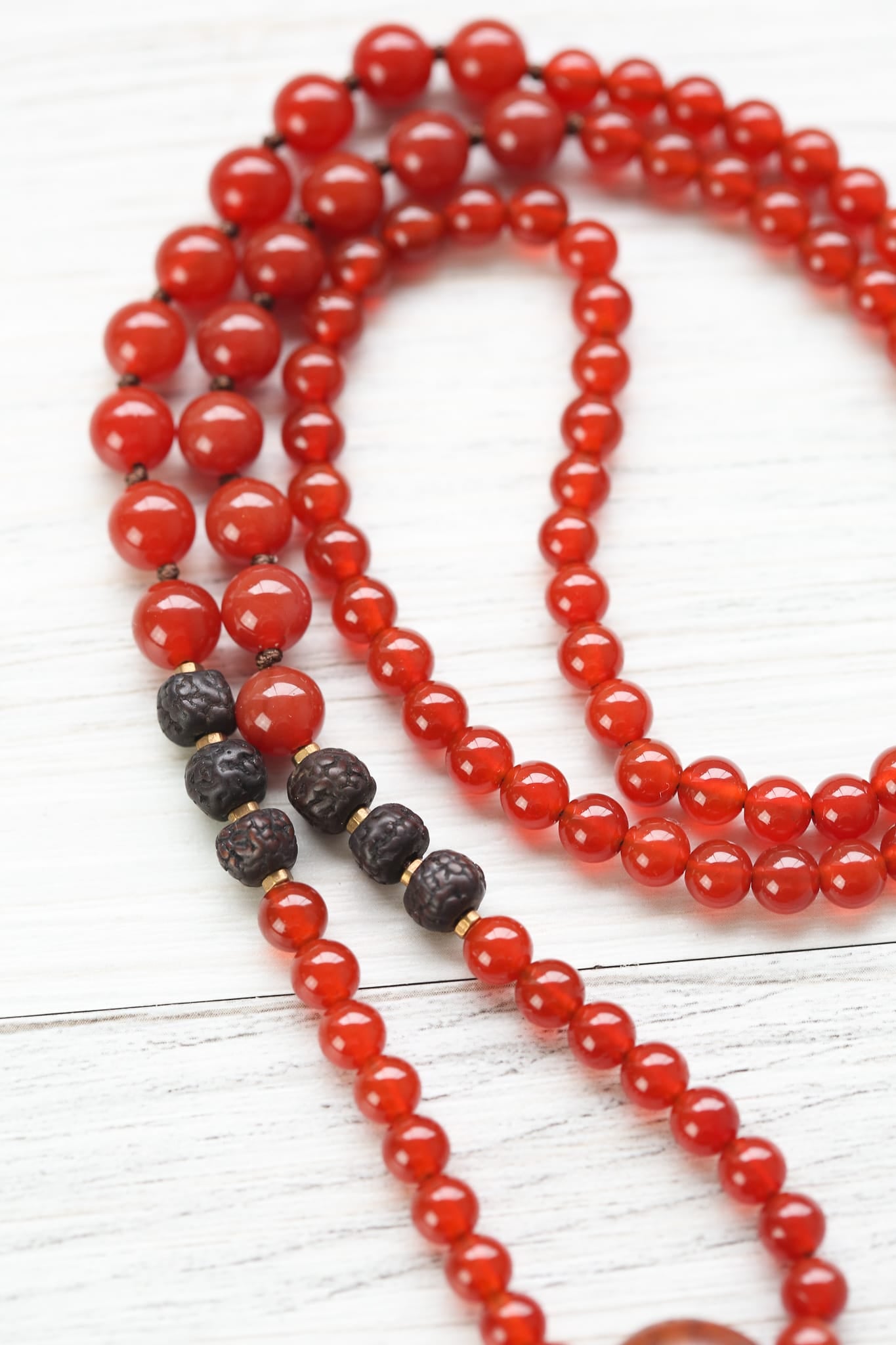 Carnelian beads are 6mm and 8mm. Rudraksha seeds ~6-7mm, and the Bodhi Guru is 12-14mm.