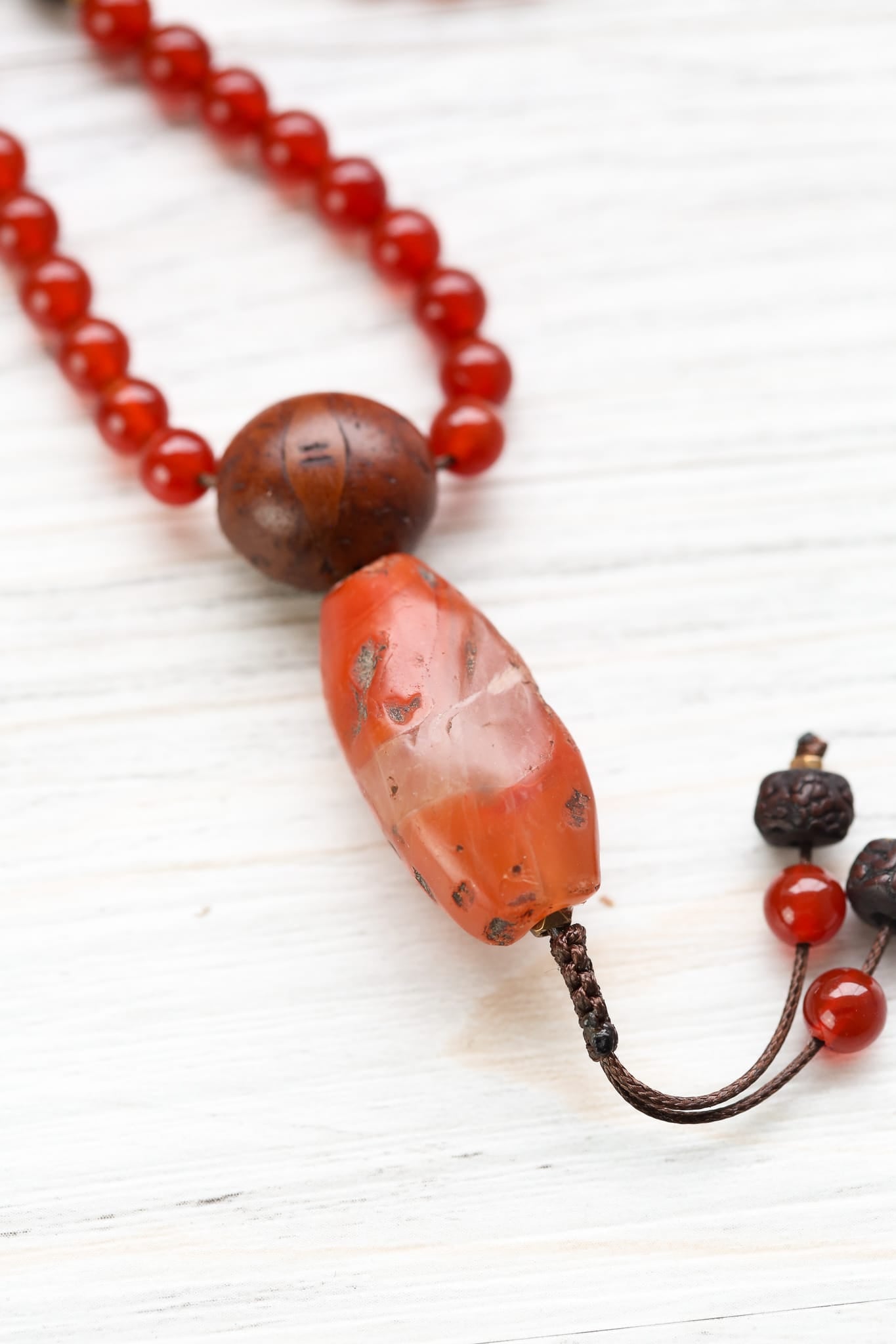 To ground the fiery energy of Carnelian, we paired it with two of the most revered seeds in Himalayan tradition. A Bodhi Seed guru bead honors the Buddha's enlightenment, while Rudraksha seed beads bring nature's steadiness and protective presence. Together, these sacred materials speak to the full path: energy and calm, courage and compassion, strength and awakening.