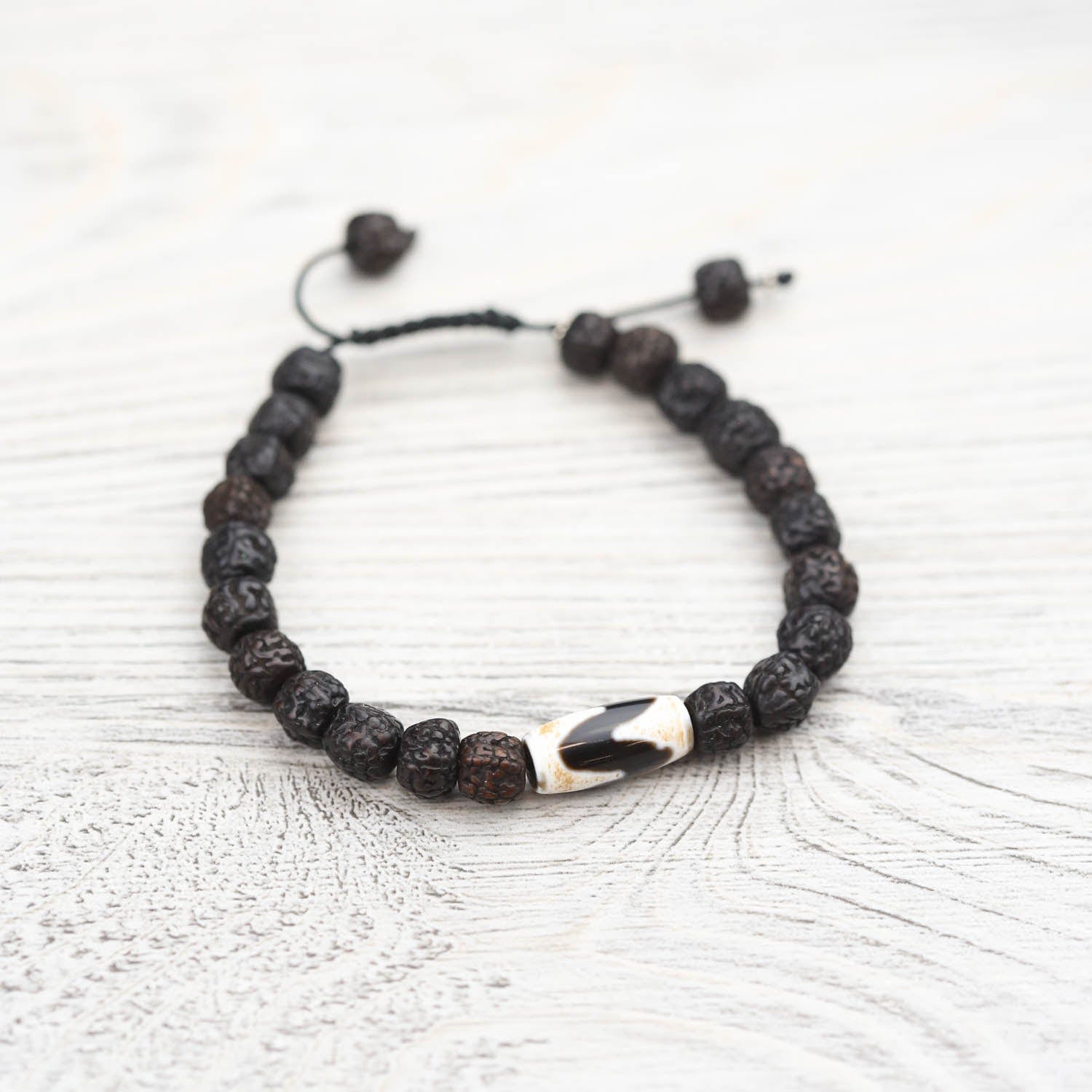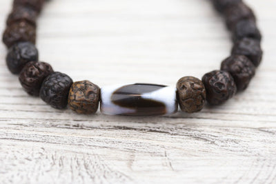 Rudraksha beads are known for their healing properties and protective powers. By meditating with a rudraksha mala, it is believed to increase the ability to concentrate, giving clarity and peace of mind. The natural and sustainable seed beads have amazing texture and visual appeal.