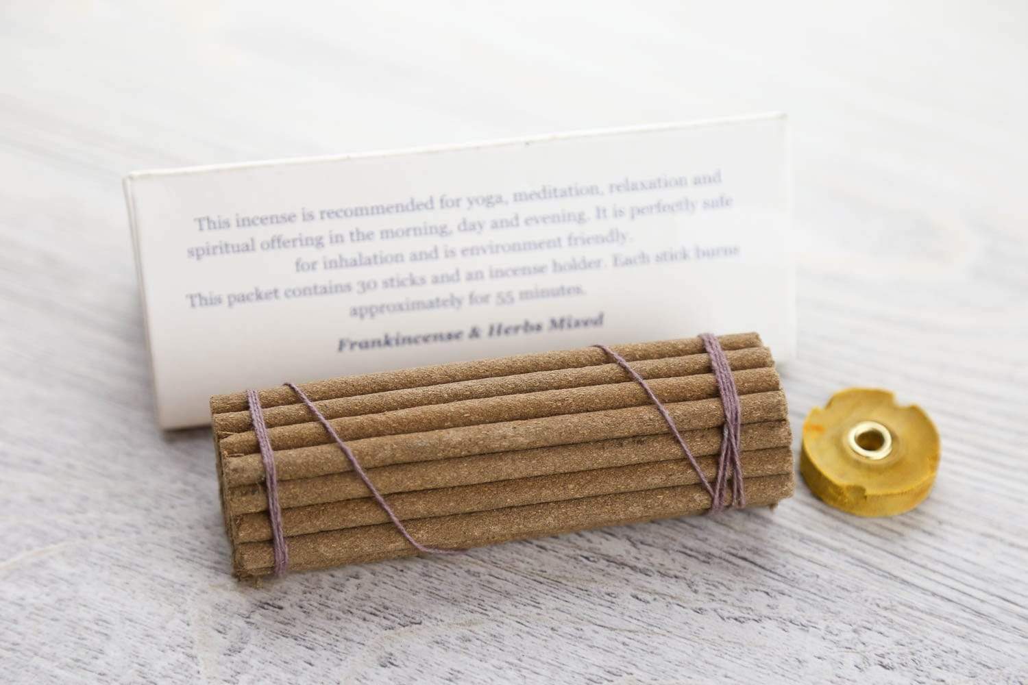 Recyclable package measures about 5 inches long and 2 inches wide. Includes about 30 sticks and a small wooden burner. Handmade in Nepal.