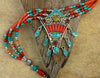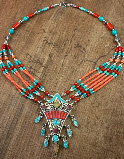 A traditional Tibetan design. Coral, turquoise, mountain jade, glass and silver beads are strung with a large silver plated pendant, inlaid with coral, amber and turquoise stones. This pendant has a very unique look. Handmade in Nepal.