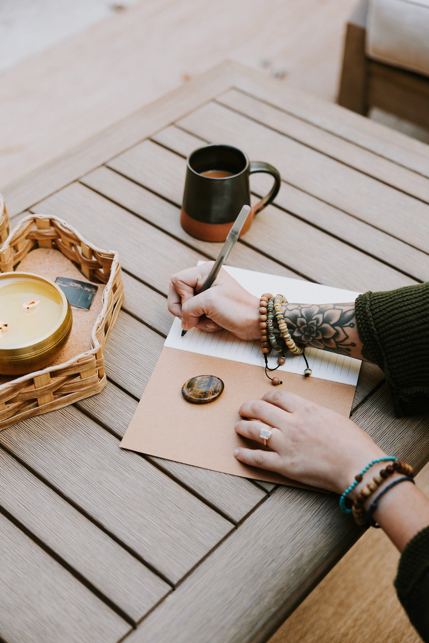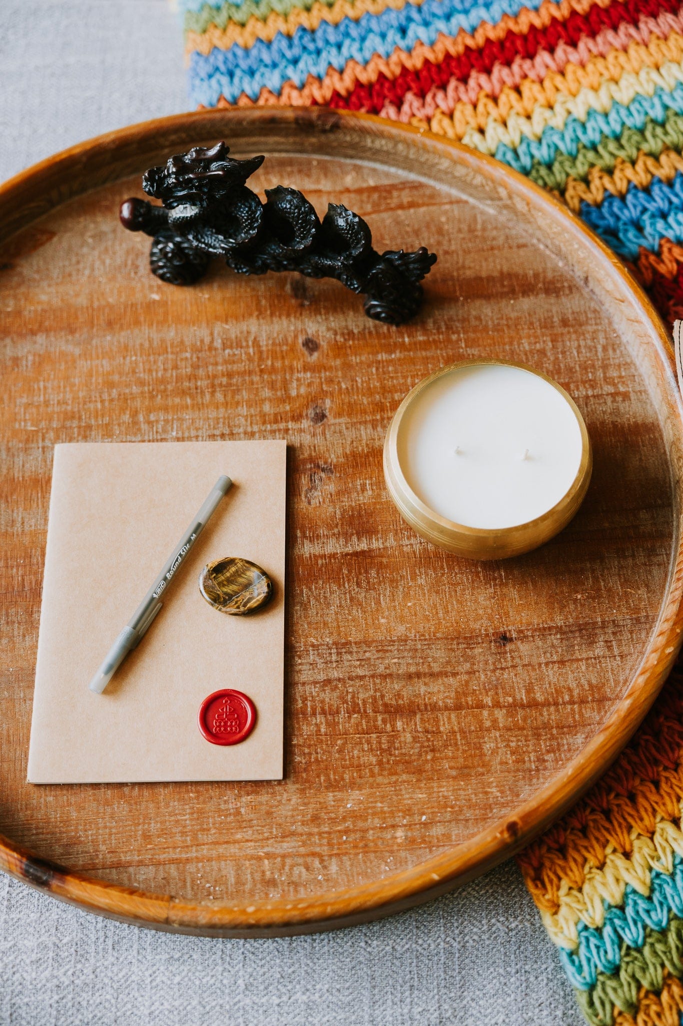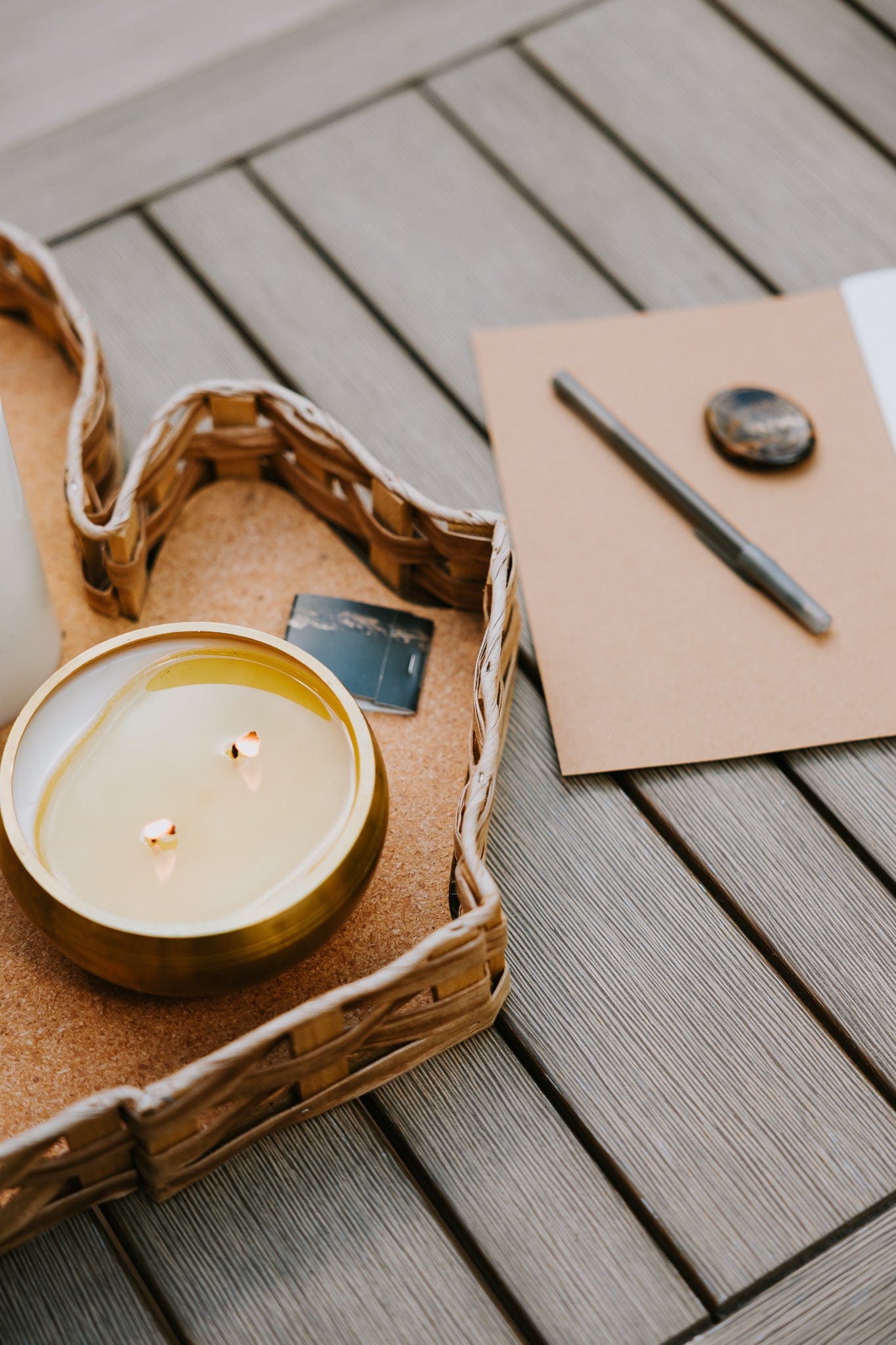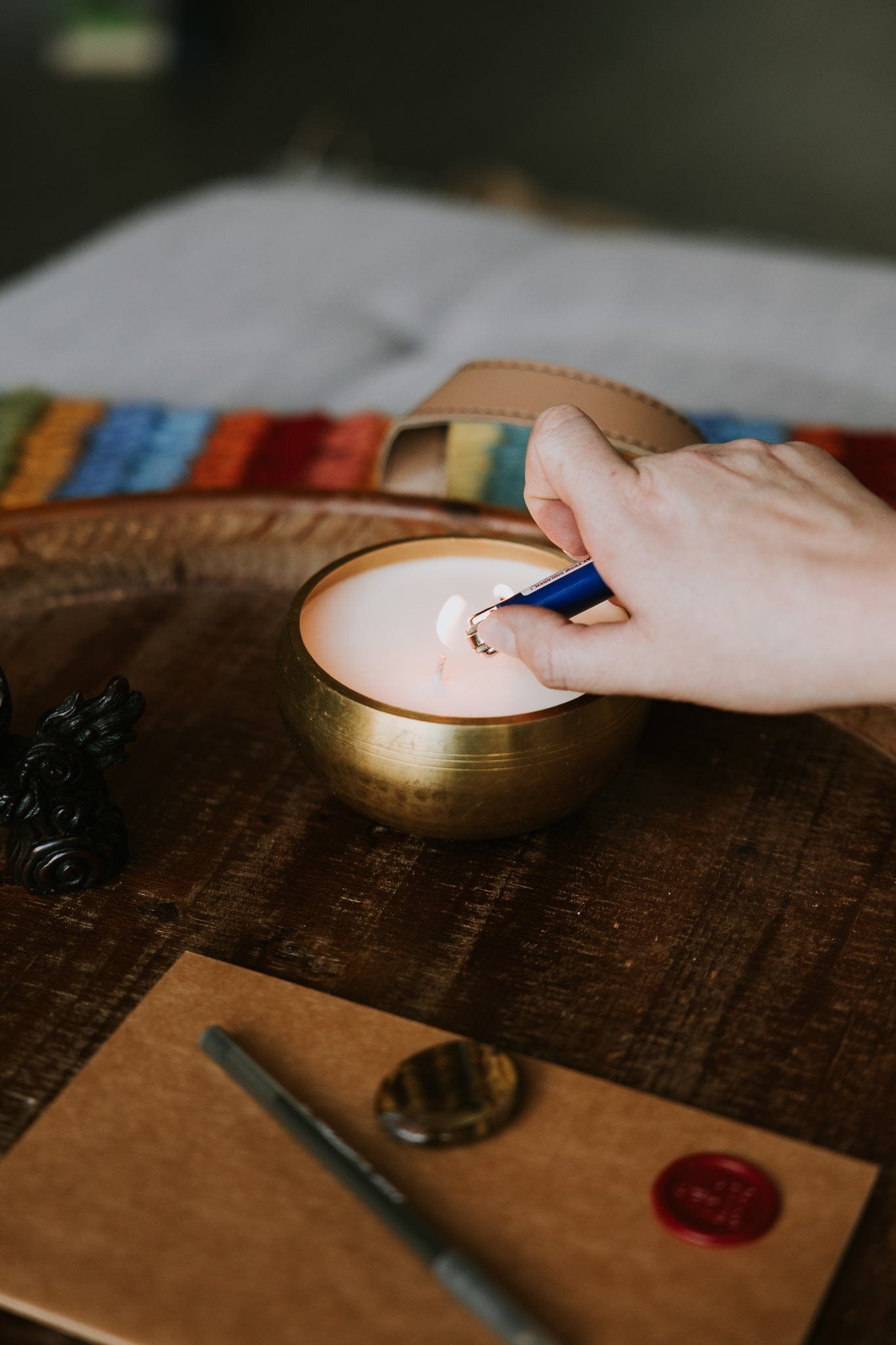 Set a focused and intentional atmosphere with our unique Singing Bowl Candle. The warm glow and calming scents of Sandalwood and Amber create a serene environment for meditation and journaling. After the candle burns, enjoy the relaxing tones of a handcrafted singing bowl. 4.5-5" in diameter, comes with striker.