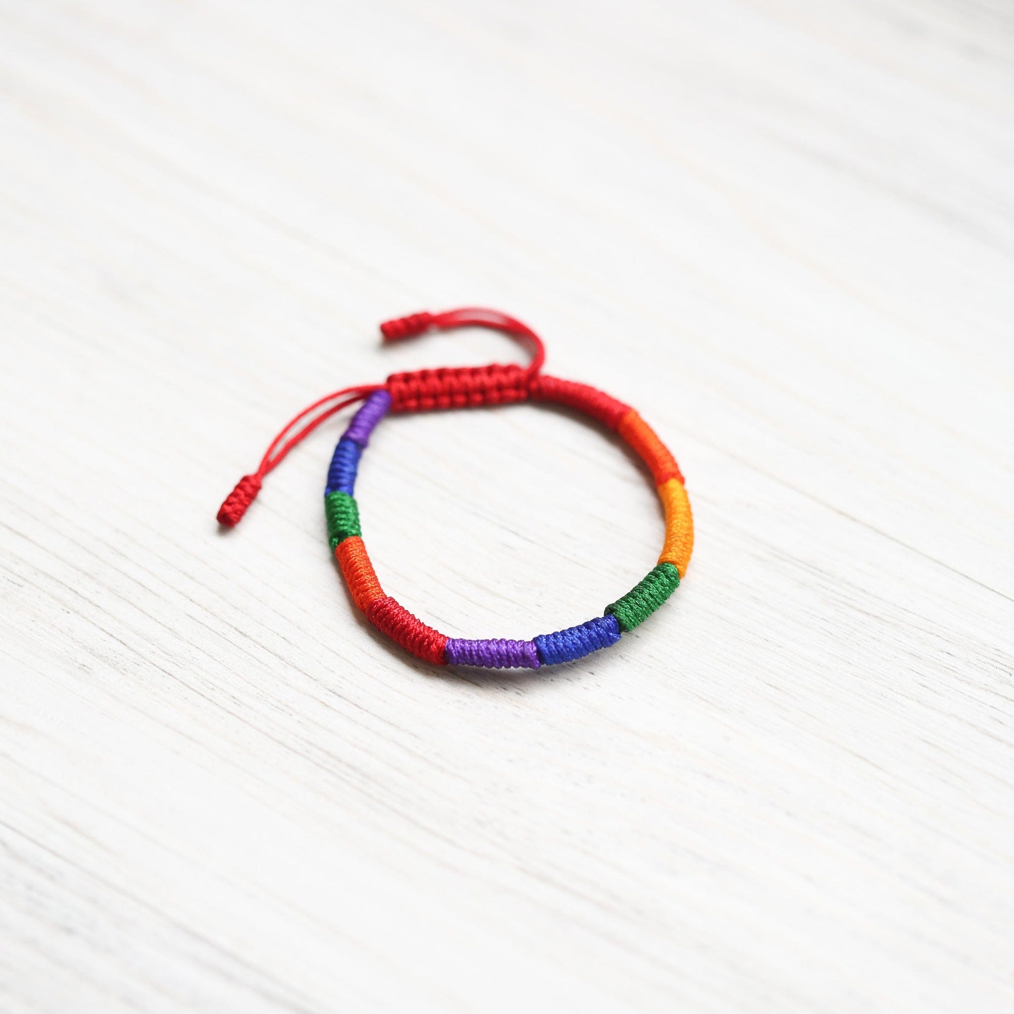 The rainbow colors carry their own meaning — red for courage, orange for creativity, yellow for happiness, green for compassion, blue for peace, and purple for wisdom — coming together as a symbol of harmony and wholeness. A rainbow can also signify inclusivity, diversity, and Pride, making this bracelet a celebration of individuality and connection.