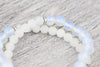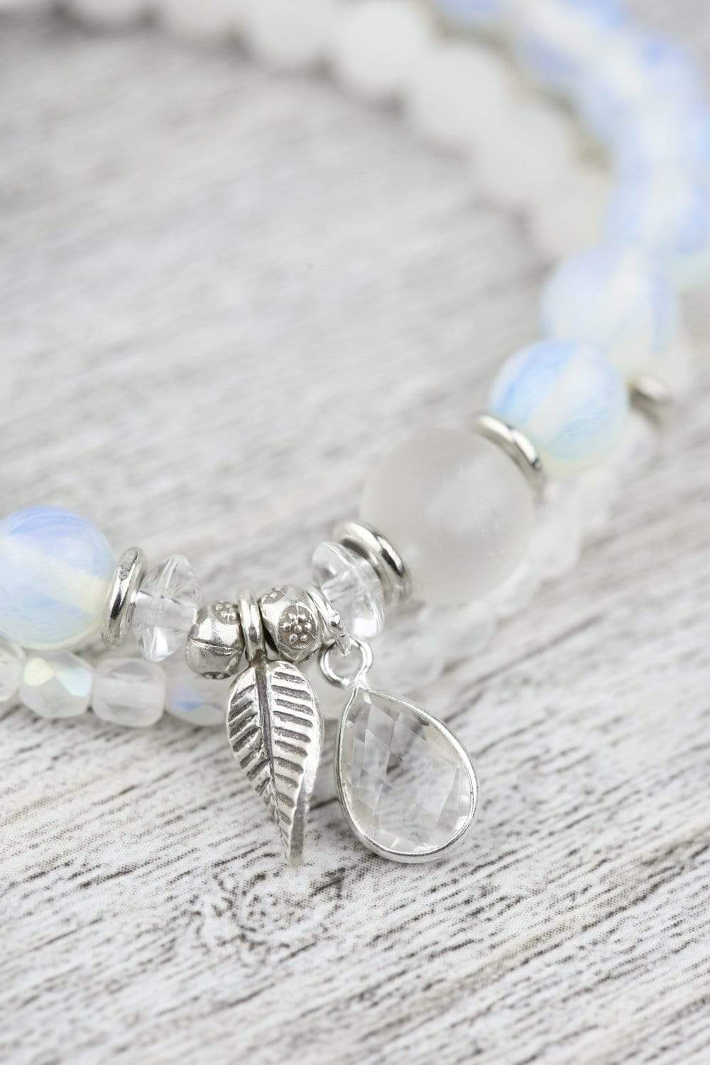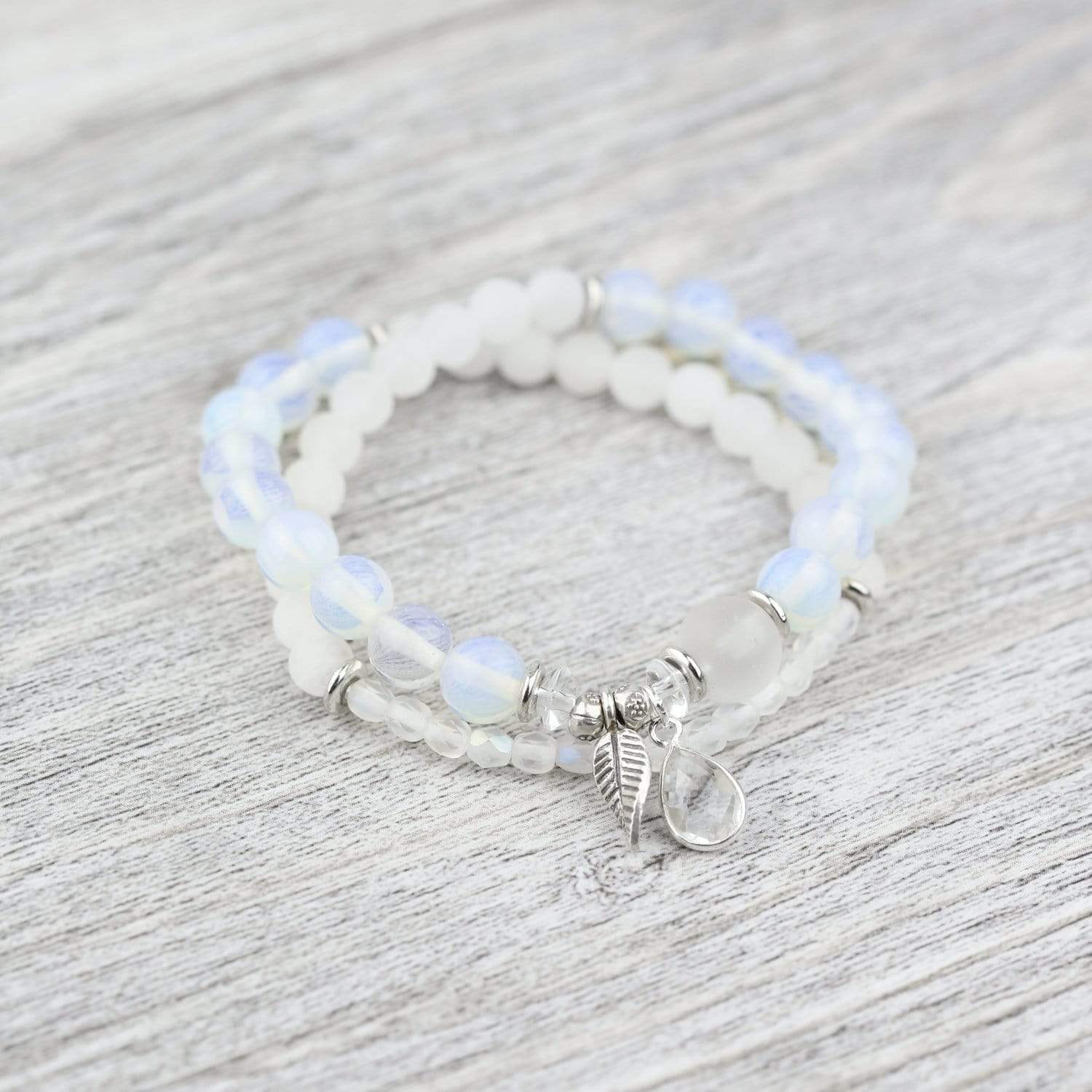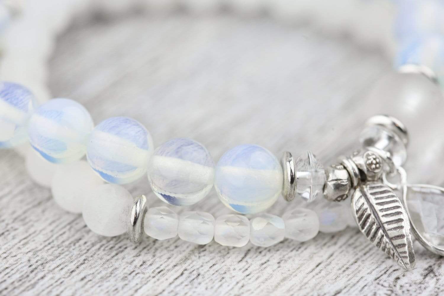 Bracelet measures approximately 6.75 inches around when double wrapped.  Opalite beads are 8mm, snow quartz beads are 6mm, faceted czech beads are 5mm, clear quartz bead is 10mm.  Feather charm is about 12mm, clear quartz charm is about 15mm.
