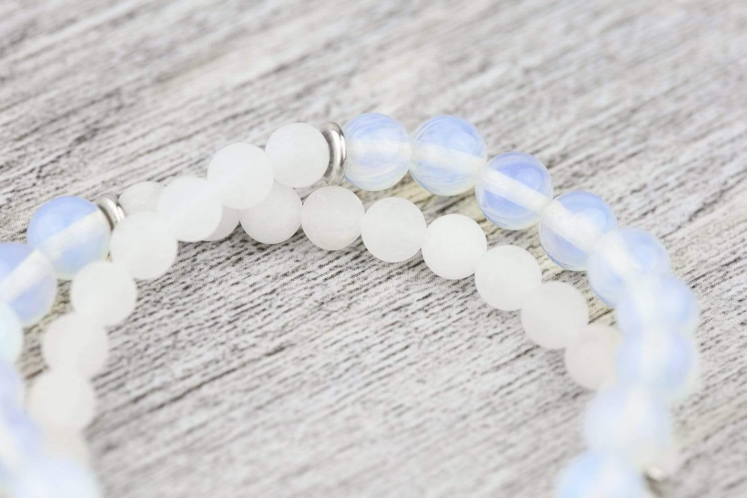 • It features a combination of Opalite, faceted Czech glass, matte Snow Quartz beads, and Hill Tribe silver spacers.