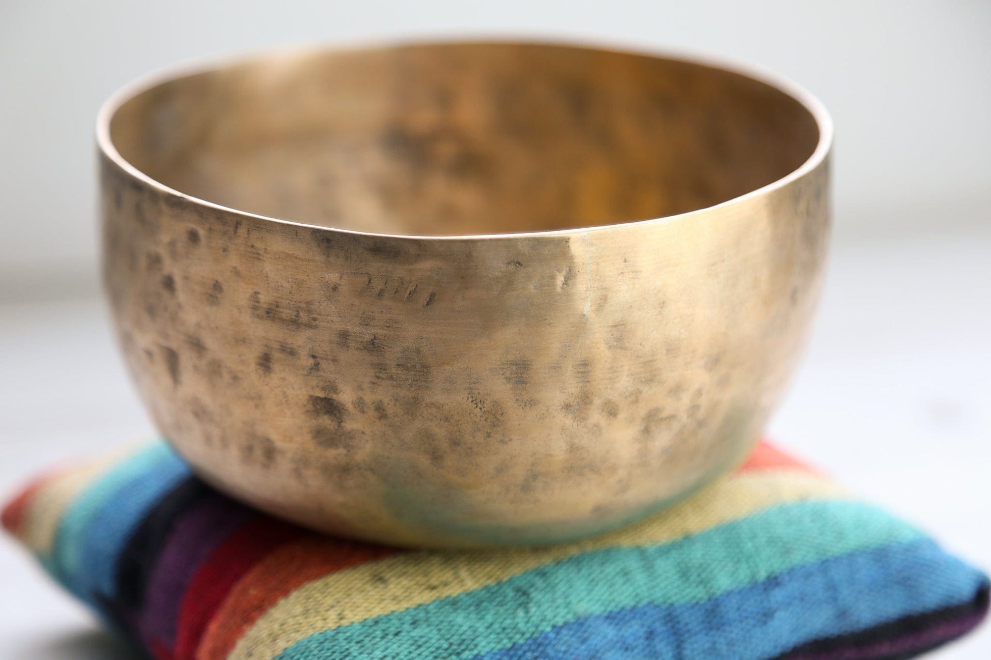 Each time we're able to get a small collection of these bowls is exciting as they are exceptional. Antique Tibetan singing bowls are highly sought after for their remarkable quality of sound, rich tones, and unique physical characteristics. Every handmade mark tells a story of the bowls history! In your hands, we know that these bowls will continue to be a lifetime heirloom, telling their story through their unique markings and golden tones.
