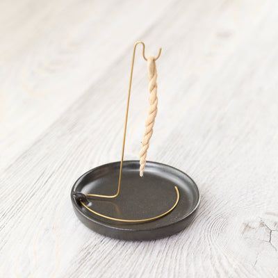 • It features a brass stand that hooks into the base of the burner, allowing you to easily hang and burn your rope incense.  The ceramic base makes it great for burning cone incense too!