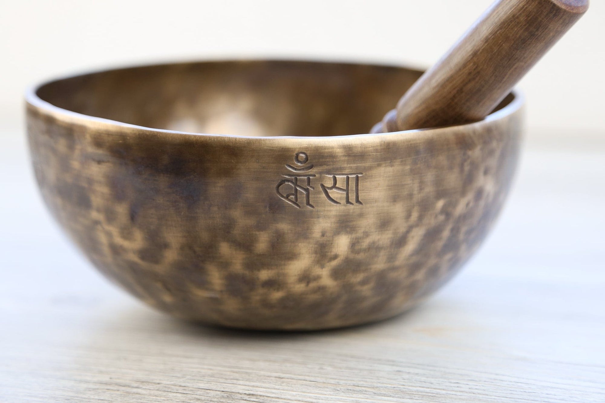 Bowl rings at an F note when struck with a woolen mallet. This note resonates with the Heart Chakra, which is the center of real, unconditional affection, spiritual growth, compassion, devotion and love.