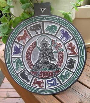 This intricatly carved stone depicts Tara in the center of the Tibetan Calendar. Each wall plaque is hand carved and hand painted. Made for indoor use, can be used outdoors but colors may fade.