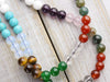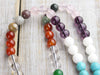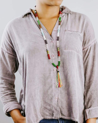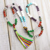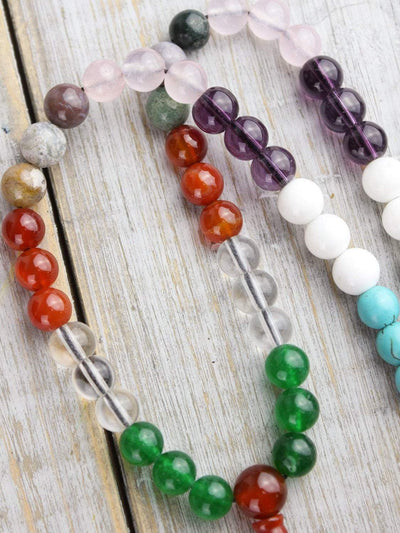 This awesome new 108 bead Tibetan mala necklace features bold and bright colors and gemstones to help promote chakra balance and healing! It features turquoise, white jasper, amethyst, rose quartz, moss agate, carnelian, clear quartz, jade, tiger eye, and opalite gemstones and is finished with a rainbow silk tassel.