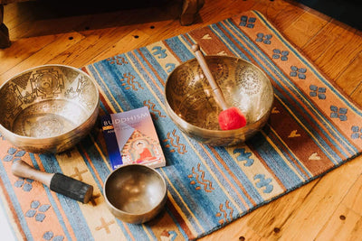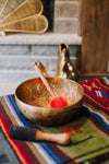 Your bowl comes with a wood and suede striker and our large blue ring cushion hand stitched and stuffed with up-cycled materials. Includes a DharmaShop keepsake bag.