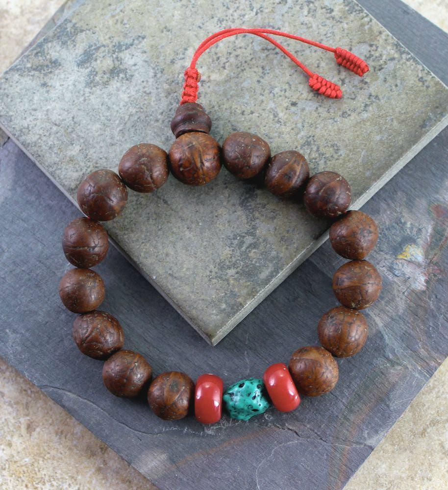 This natural bodhi seed wrist mala features coral and pressed turquoise accents. The adjustable wrist mala is great for larger wrists. Handmade in Nepal.