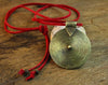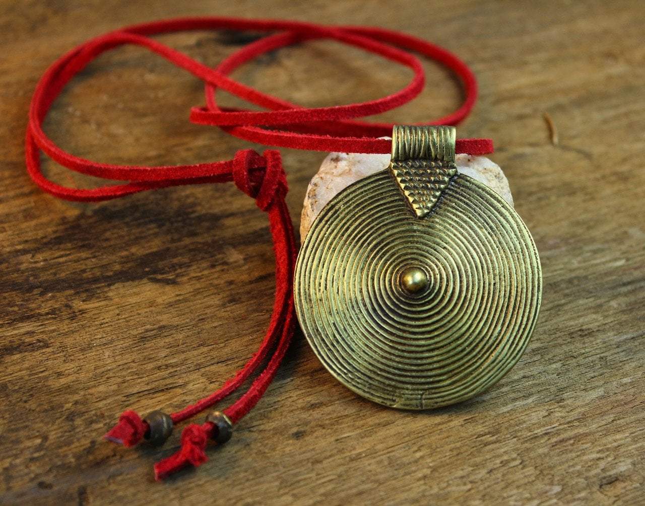 A beautiful, large handmade spiral pendant hangs from a long red suede cord with brass end beads.