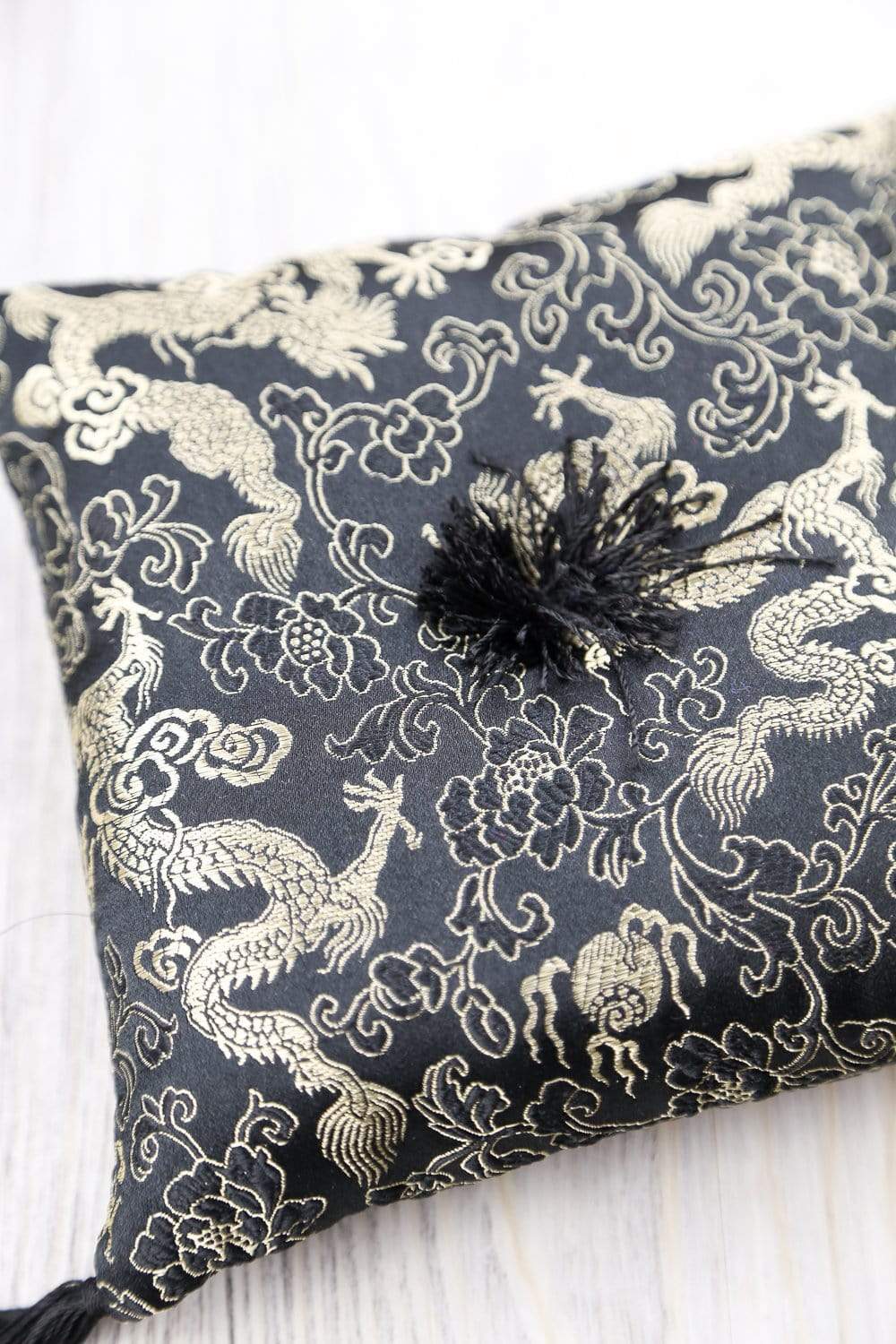 • Made of black polyester, it features a beautiful gold dragon brocade design with matching black tassels.