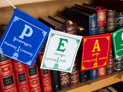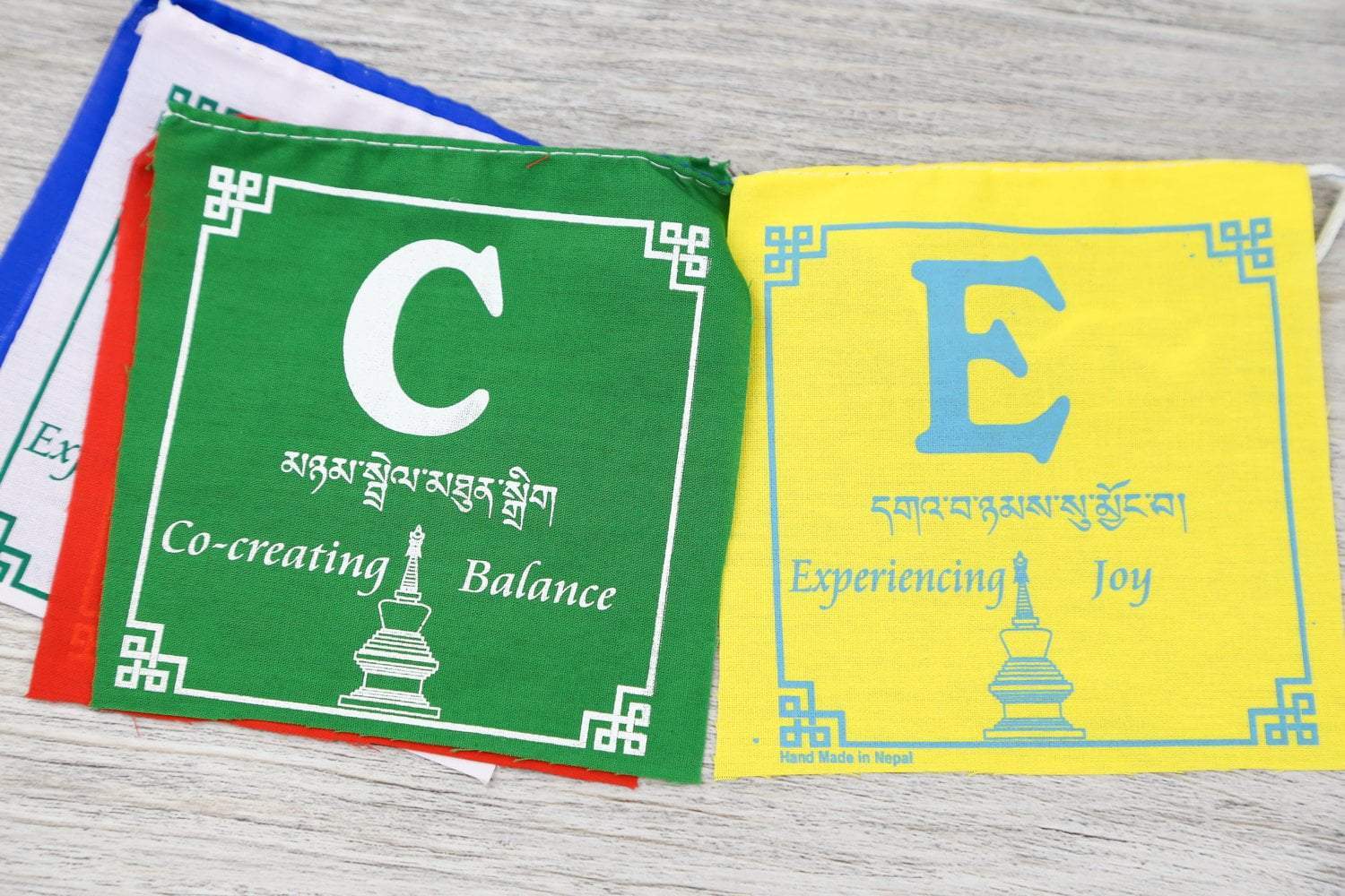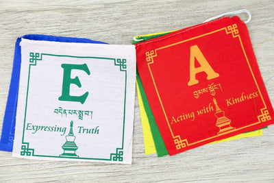 This small set of polyester prayer flags are screen printed by the hands of Tibetan artisans in Kathmandu.