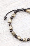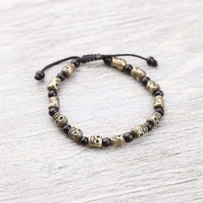 • Handmade in Kathmandu, Nepal featuring a bold combination of brass skulls and dark wood beads on adjustable cord.
